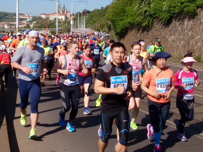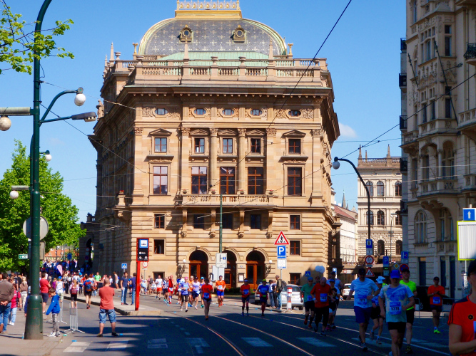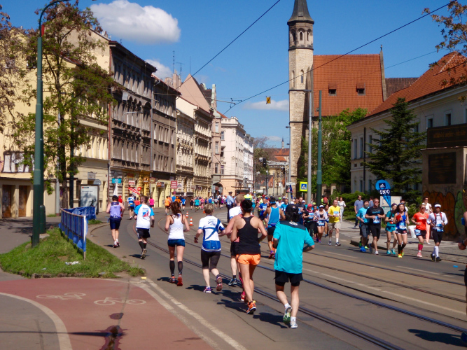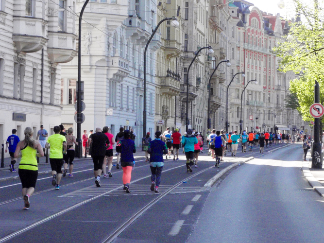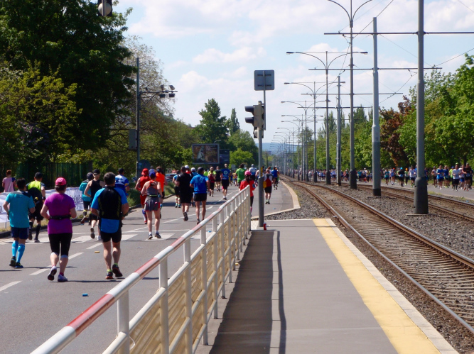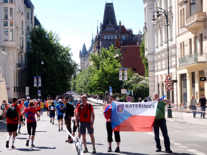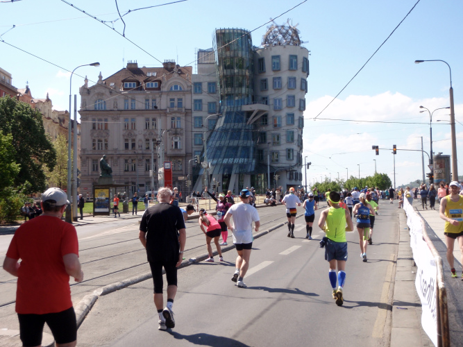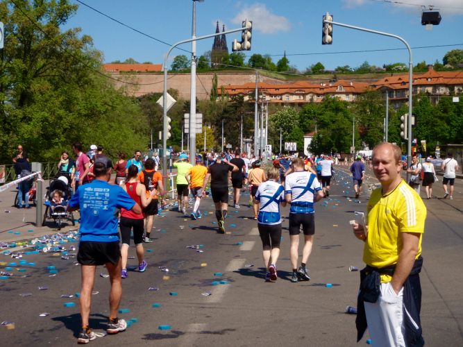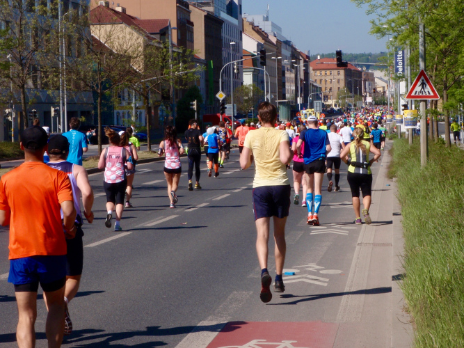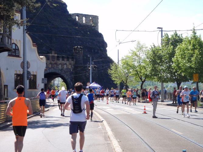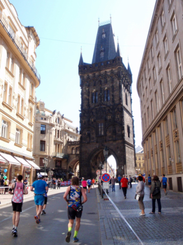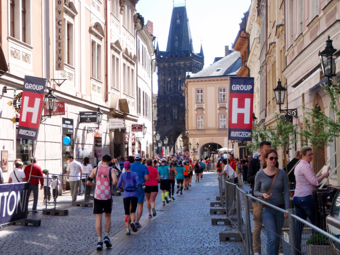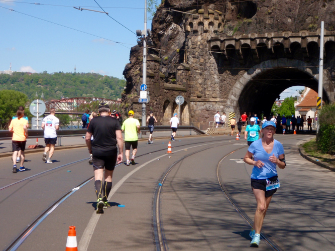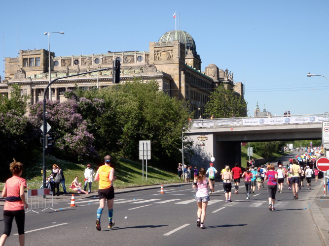 Zwei Brücken werden unter-, ein längerer Tunnel durchquert. Kurz danach biegen wir links in die Altstadt ab und laufen über die Pařížiská zurück zum Altstädter Ring. Hier „tobt der Bär“, obwohl wir erst gut zwölf Kilometer hinter uns haben: Dafür geht es jetzt entgegen der Startaufstellung die Celetná, die Krönungsgasse, entlang. Weil in der Mitte ein schmaler Streifen nicht gepflastert ist, laufen fast alle Läuferinnen und Läufer im „Gänsemarsch“ hintereinander her – ein hübscher Anblick. Der Pulverturm markiert die Grenze von Alt- und Neustadt, auf der wir auch im Folgenden weiterlaufen. Dabei überqueren wir das untere Ende des Wenzelsplatzes, der allerdings wegen der Marathoninfrastruktur und des baustellenverhüllten Nationalmuseums am oberen Ende des Platzes kaum auffällt. Der Platz ist berühmt wegen der tragischen Vorgänge am 21. August 1968, als der „Prager Frühling“ des liberalen Reformers Alexander Dubček mit Truppen des Warschauer Paktes niedergewalzt wurde. Ich, damals gerade wenige Tage zuvor mit neun Jahren Gymnasiast geworden, kann mich bis heute an den sonnigen Morgen erinnern, als mir meine Mutter diese Vorkommnisse schilderte – und versprach, nie mehr ins „unsichere Ausland“ zu reisen. Noch knapp 25 Jahren später, bei einem Besuch der fantastischen Kleinstadt Český Krumlov (Krumau) in Südböhmen, war sie total verunsichert und das Eis schmolz erst, aber ganz schnell, als die Kellnerin in einem typischen „Wiener Café“ als erstes mit einem Wassernapf für unseren Hund an den Tisch kam!