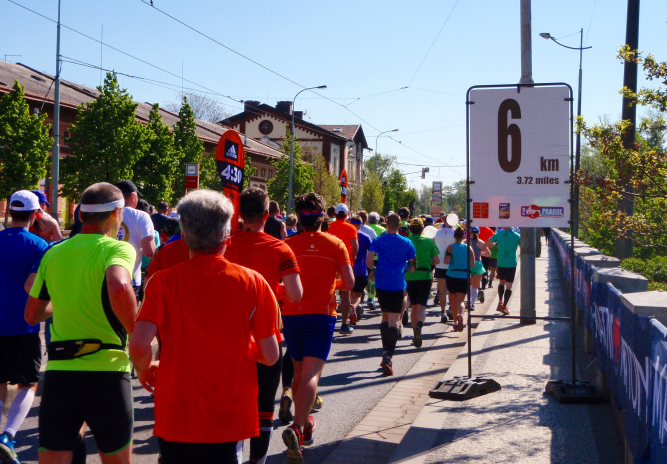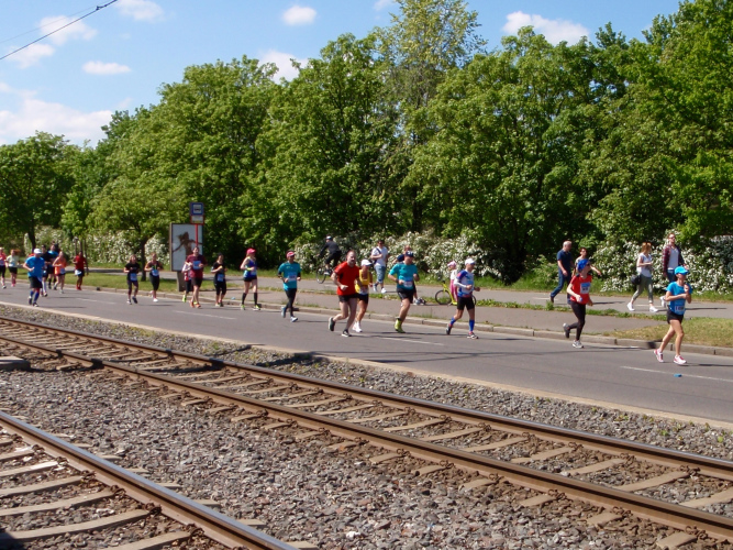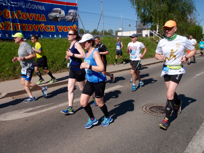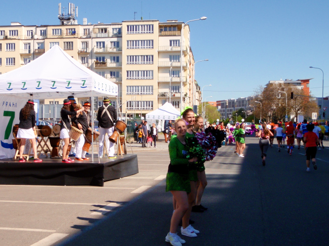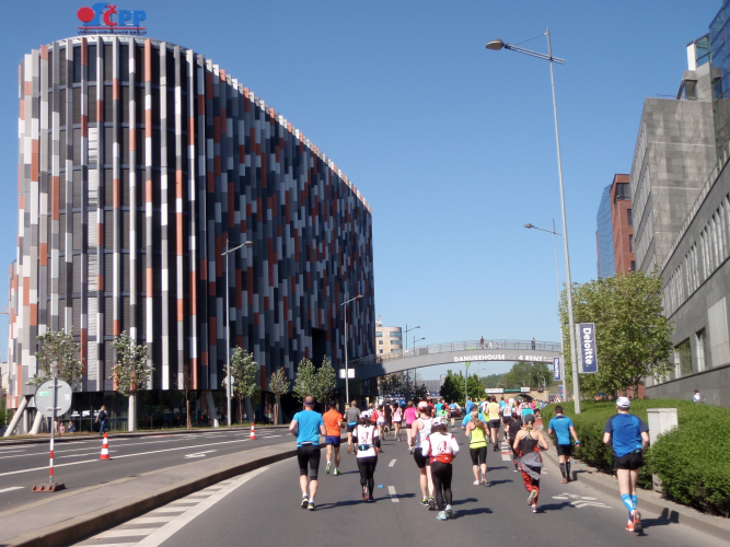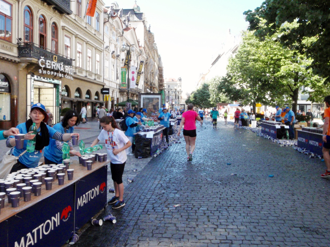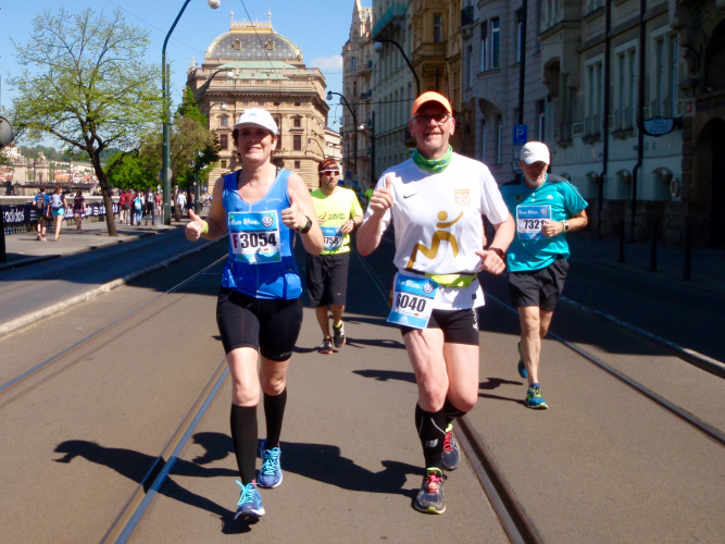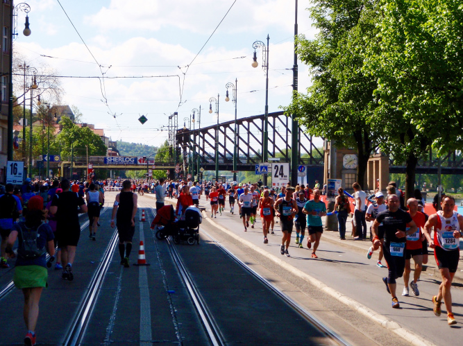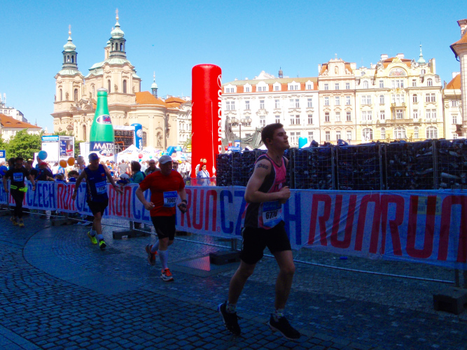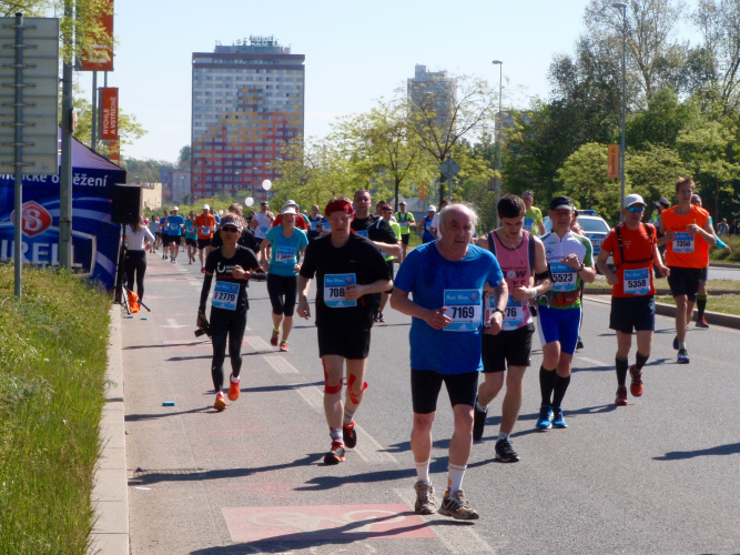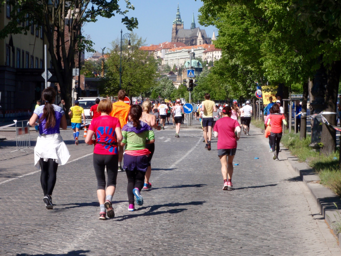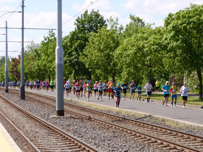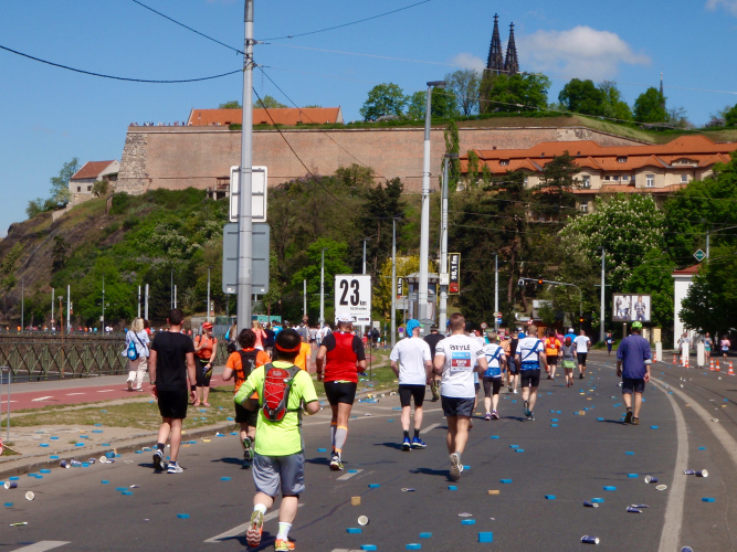 Zwei Brücken werden unter-, ein längerer Tunnel durchquert. Kurz danach biegen wir links in die Altstadt ab und laufen über die Pařížiská zurück zum Altstädter Ring. Hier „tobt der Bär“, obwohl wir erst gut zwölf Kilometer hinter uns haben: Dafür geht es jetzt entgegen der Startaufstellung die Celetná, die Krönungsgasse, entlang. Weil in der Mitte ein schmaler Streifen nicht gepflastert ist, laufen fast alle Läuferinnen und Läufer im „Gänsemarsch“ hintereinander her – ein hübscher Anblick. Der Pulverturm markiert die Grenze von Alt- und Neustadt, auf der wir auch im Folgenden weiterlaufen. Dabei überqueren wir das untere Ende des Wenzelsplatzes, der allerdings wegen der Marathoninfrastruktur und des baustellenverhüllten Nationalmuseums am oberen Ende des Platzes kaum auffällt. Der Platz ist berühmt wegen der tragischen Vorgänge am 21. August 1968, als der „Prager Frühling“ des liberalen Reformers Alexander Dubček mit Truppen des Warschauer Paktes niedergewalzt wurde. Ich, damals gerade wenige Tage zuvor mit neun Jahren Gymnasiast geworden, kann mich bis heute an den sonnigen Morgen erinnern, als mir meine Mutter diese Vorkommnisse schilderte – und versprach, nie mehr ins „unsichere Ausland“ zu reisen. Noch knapp 25 Jahren später, bei einem Besuch der fantastischen Kleinstadt Český Krumlov (Krumau) in Südböhmen, war sie total verunsichert und das Eis schmolz erst, aber ganz schnell, als die Kellnerin in einem typischen „Wiener Café“ als erstes mit einem Wassernapf für unseren Hund an den Tisch kam!