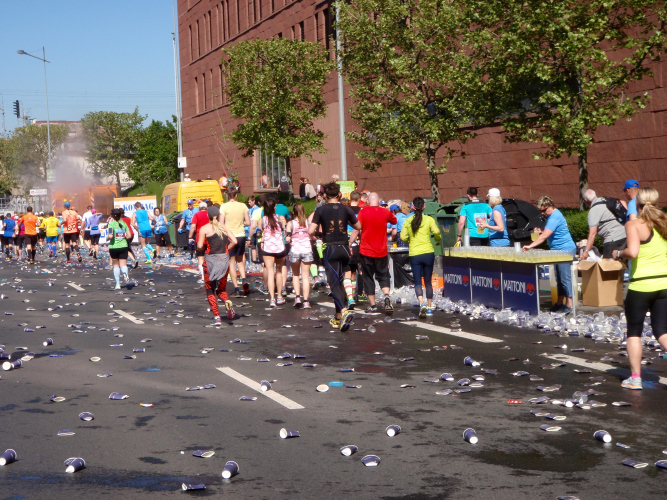 Auf dem Weg zurück in die Stadt ist es auch Zeit für einen kleinen Plausch. Weil man, auch anhand der Shirts, nur selten deutsche Läufer sieht, die bei diesem Marathon deutlich unterrepräsentiert zu sein scheinen, fällt mir Thomas aus Münster mit seiner Deutschland-Kennzeichnung am Rücken auf. Während des Laufs werden wir uns immer wieder sehen. Die Gebäude längs der Laufstrecke werden jetzt, nach einer längere Zeit unbebauten Strecke, zunehmend städtischer, wobei hier selbst ein modernes Gebäude wie das Danubehaus einer Versicherung einen architektonisch durchaus gelungenen Glanzpunkt setzt. An den Verpflegungsstellen – immer im 3-Kilometer-Wechsel nur mit Wasser und dann mit weiteren Getränken sowie Verpflegung – herrscht auch jetzt, nach gut zehn Kilometern, schon großer Andrang. Viele Läufer wissen angesichts der kräftigen Sonneneinstrahlung ihren Getränke- und Erfrischungsbedarf richtig einzuschätzen und nutzen auch gern die reichlich angebotenen Wasserschwämme. Denn die Sonne meint es heute sehr, sehr gut, auch wenn es nur gut warm, aber nicht richtig heiß wird.