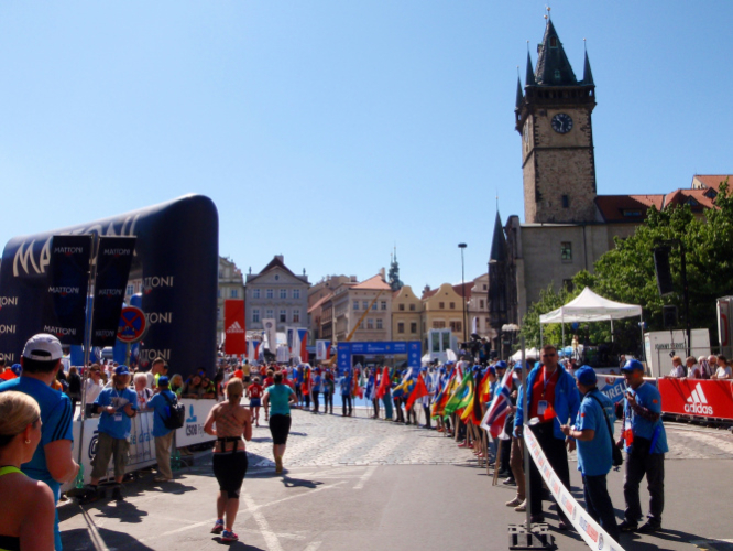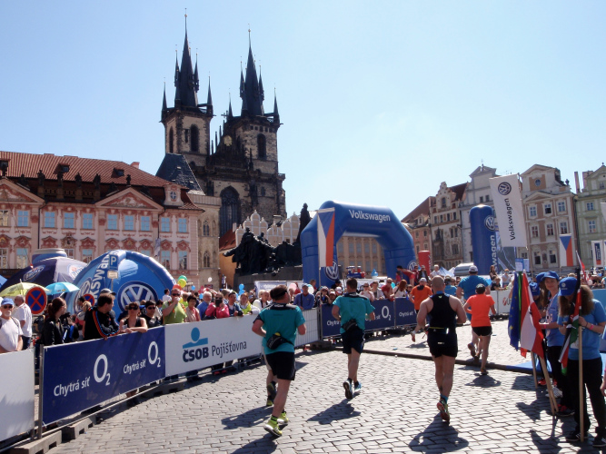Prag ist für mich nicht „irgendeine“ Stadt, sondern verbunden mit vielen persönlichen Erinnerungen. Damals vor 25 Jahren trank ich auch Wasser aus der Quelle der Kalten Moldau nahe Bischofsreut im Böhmerwald – kurios, dass eine der beiden offiziellen Quellen der Moldau ausgerechnet in Bayern entspringt und dann noch einige Kilometer auf der bayerischen Seite fließt, ehe sie bei Nove Udoli (Neuthal) die Grenze passiert und sich kurz darauf in Böhmen mit der Warmen Moldau vereinigt. Wer die „Moldau“ von Bedrich Smetana hört, kann gleich am Anfang beide Quellflüsse deutlich unterscheiden. Gerade wegen der glücklichen Erinnerung hat es mich vorhin am Start ungemein berührt und mir die Tränen in die Augen getrieben, als sich 6.000 Läufer zu den Klängen des zehn Minuten lang gespielten „Moldau“-Hauptthemas in Bewegung gesetzt haben.
