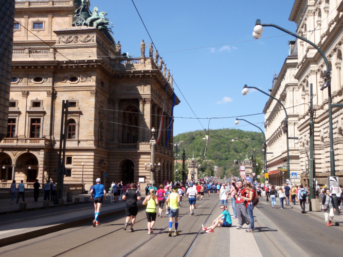 Und es folgt gleich die nächste Erinnerung, diesmal an den ersten längeren Besuch 1994 in Prag fünf Jahre nach der „samtenen Revolution“: Damals war Prag noch nicht die unglaublich feine, saubere und glänzende europäische Metropole wie heute. Das Nationaltheater, das wir gerade auf Kilometer 15 passieren und in dem ich damals die „Verkaufte Braut“, die bekannteste tschechische Oper überhaupt, besuchte, war allerdings schon erneuert worden. Es steht, wie Rudolfinum und Nationalmuseum, für die nationale Wiedergeburt in Prag in der zweiten Hälfte des 19. Jahrhunderts. Smetana hatte, über ein Jahrzehnt vor Fertigstellung des Theaters, bereits die tschechischste seiner Opern, Libuše, geschrieben, quasi über die Begründerin der böhmischen Nation und den Beginn der 400 Jahre langen Přemysliden-Herrschaft. Diese Oper, für die ich heute, drei Stunden nach dem geplanten Marathonende, eine Eintrittskarte für das Nationaltheater habe, ist interessanterweise trotz ihrer zeitlichen Verortung im frühen Mittelalter überhaupt nicht kriegerisch, sondern hat mit ihrer Betonung gelungener Friedensstiftung durch Barmherzigkeit fast schon pazifistische Tendenz. „Barmherzigkeit“, Mitgefühl heute – wäre das nicht auch etwas für die aktuelle europäische Politik?