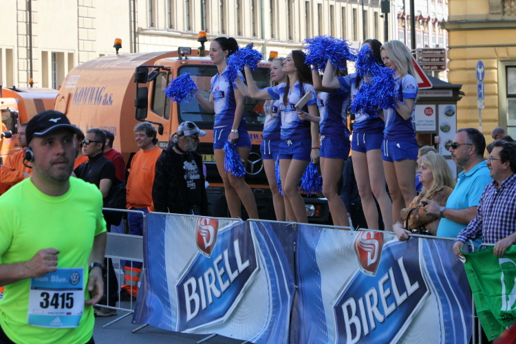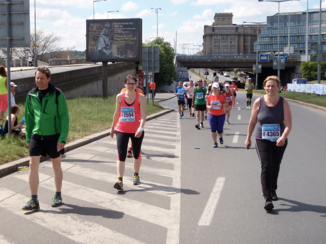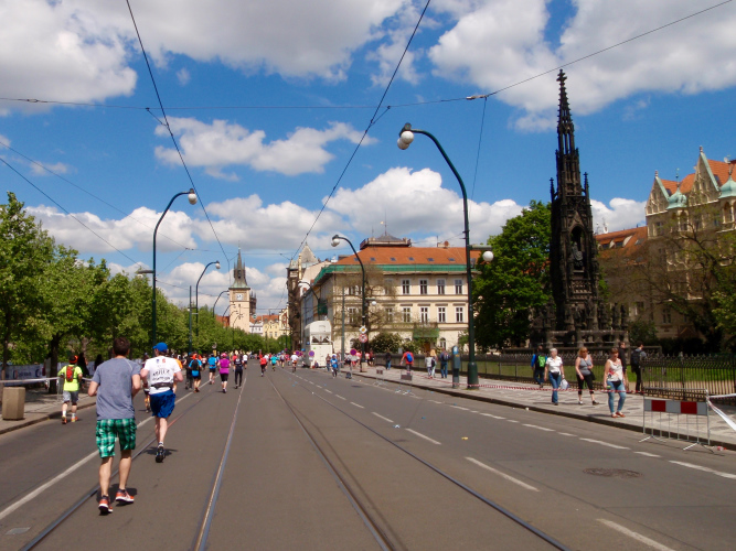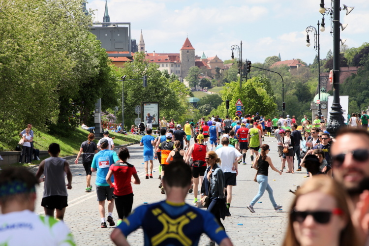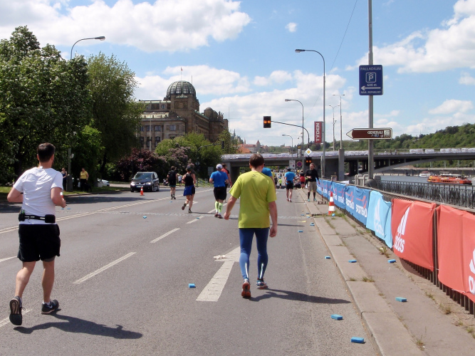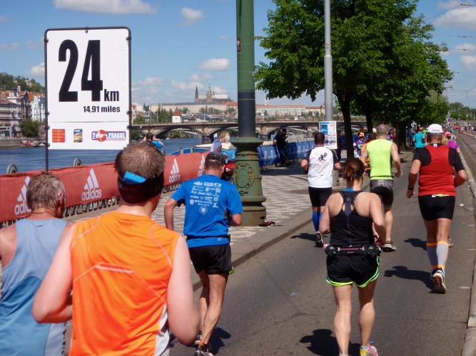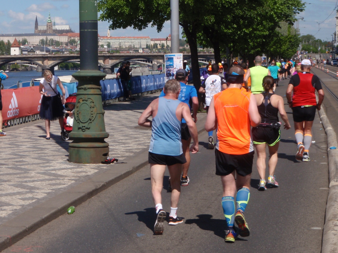 Zurückgekehrt an die Moldau müssen wir den Felsen des Vyšehrad mit einem kurzen Tunnel unterqueren, ehe die Wendestrecke noch zwei Kilometer weiter, bis kurz hinter die Halbmarathonmarke, nach Süden führt. Dann laufen auch wir den langsameren Läufern entgegen, drei Kilometer mit immer schönem Moldau-, später auch Hradschin-Blick nach Norden, und überqueren auf Kilometer 25 zum fünften Mal den Fluss. Unterhalb der Brücke kann man die Läufer sehen, die mittlerweile auf dem 31. Kilometer sind. Ein kurzer Abstecher in die Vorstadt, dann wieder eine längere, hier nicht so schöne Pendelstrecke. Solche Strecken gibt es aber beim Prag-Marathon relativ wenig und meist werden sie als Begegnungsstrecke und mit Musik aufgelockert.