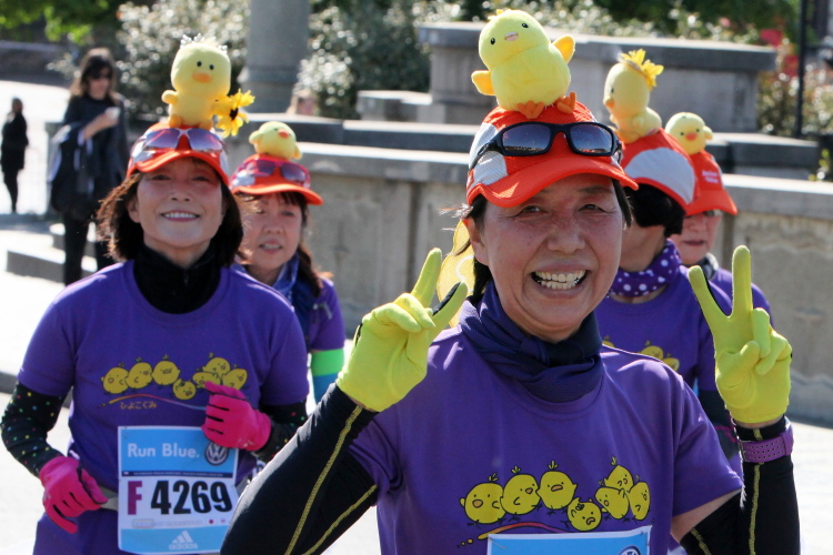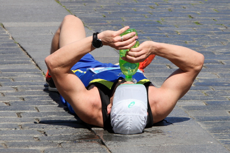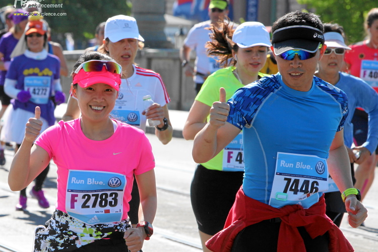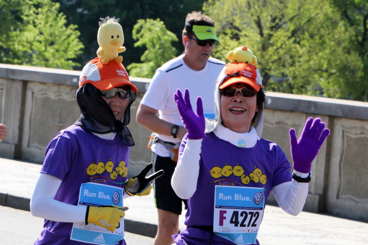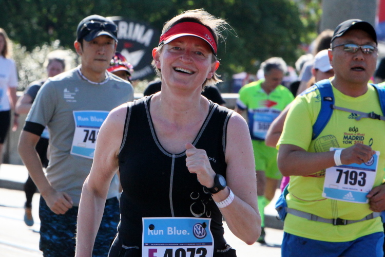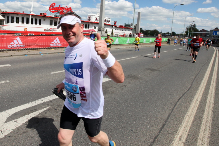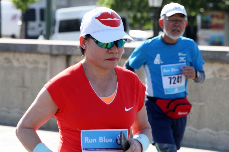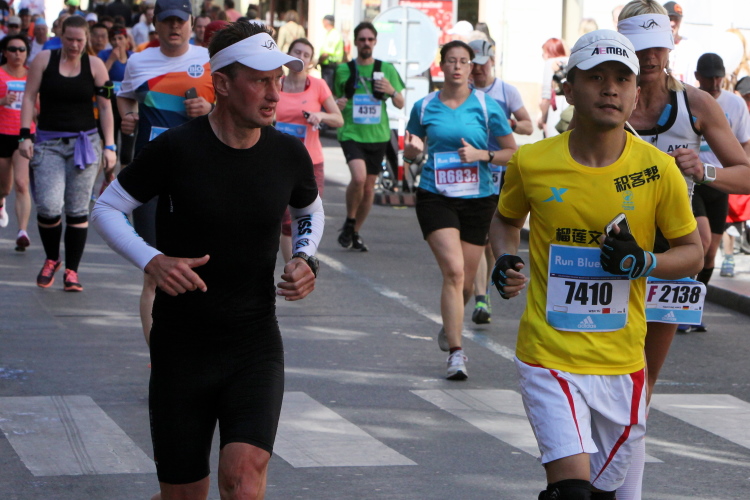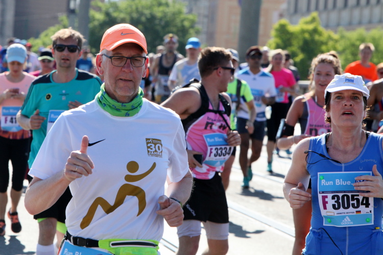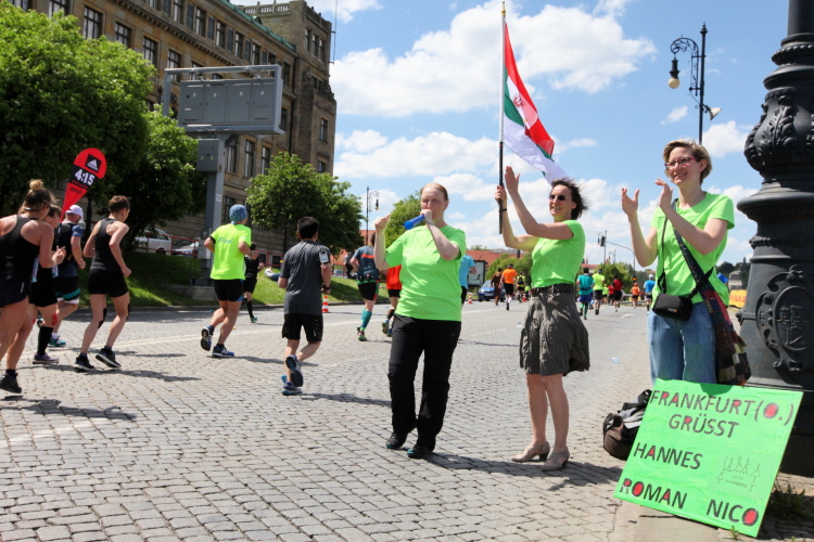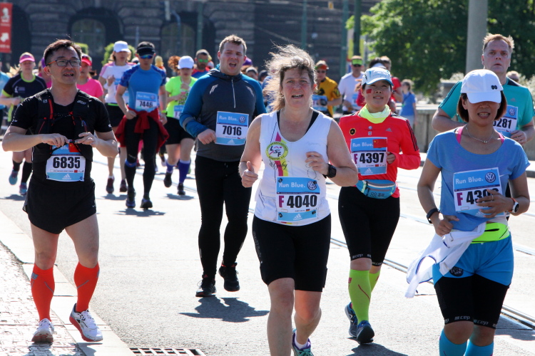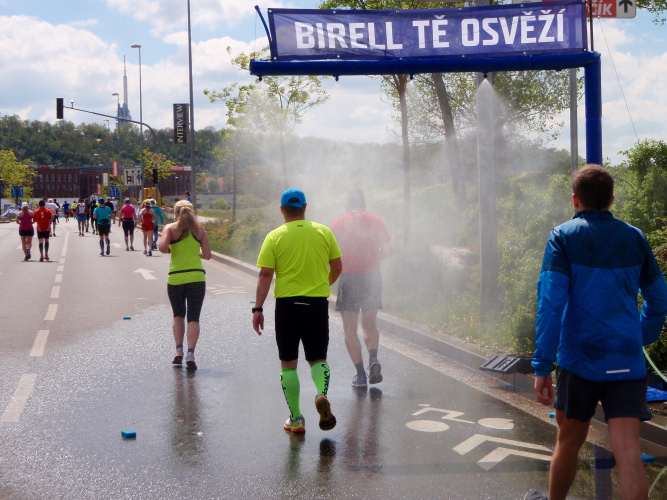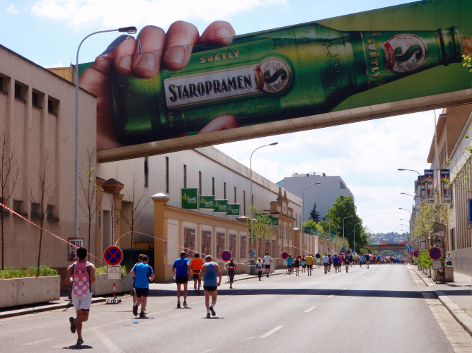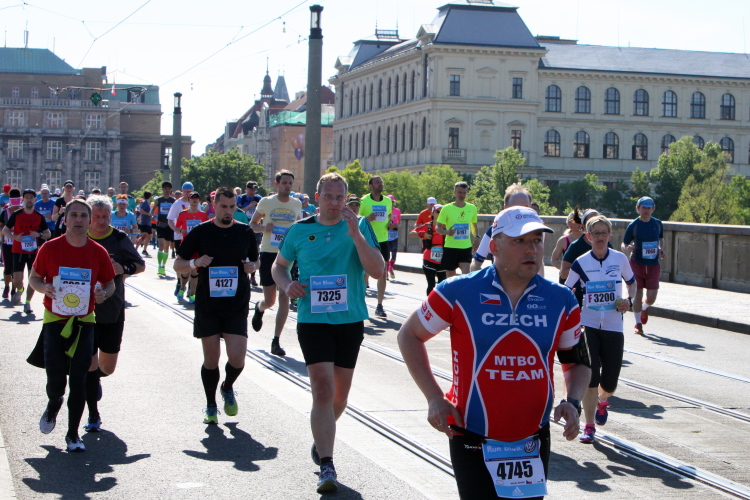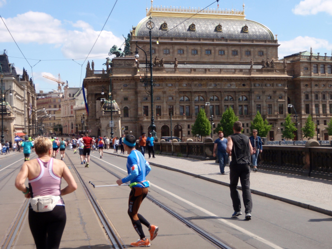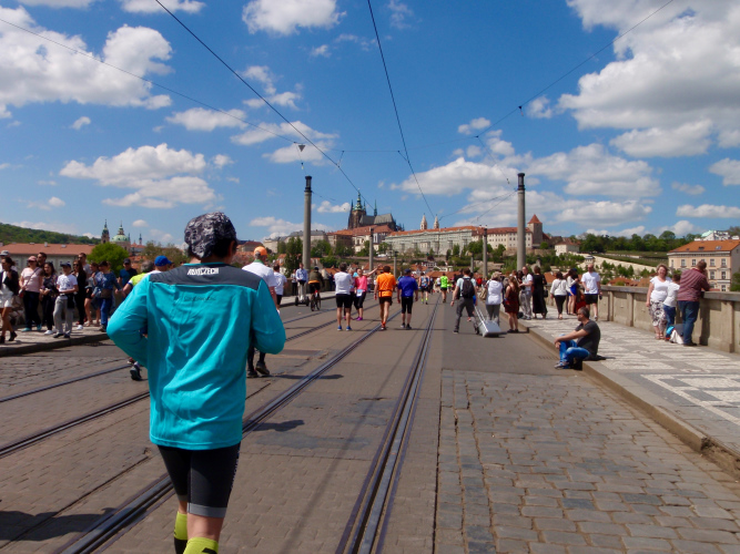 Wer den Streckenplan aufmerksam studiert hat, weiß, dass es bei Kilometer 32 zum sechsten Mal über die Moldau und direkt auf das Nationaltheater zugeht, und dass man dann einen Kilometer später, am „Panoramaufer“ der Moldau entlang, an der Ostseite der Karlsbrücke vorbei läuft. Ab hier, ab Kilometer 32,2, ist die Strecke mit der schon vorher ab Kilometer 2,8 gelaufenen Strecke identisch – was mich eigentlich nicht stört, denn Langeweile kommt nach einigen spannenden Stunden auch beim zweiten Lauf auf dieser Runde nicht auf. Es ist eher ein Vorteil zu wissen, was einen erwartet. Und das ist jetzt, beim Lauf zur weit im Osten gelegenen Libeňský-Brücke, nicht ohne. Allmählich nähere ich mich trotz Mütze einem leichten Sonnenstich. Aber immerhin weiß ich noch: Auf der Brücke steht die „37“, und danach geht es schnurstracks dem Ziel entgegen!