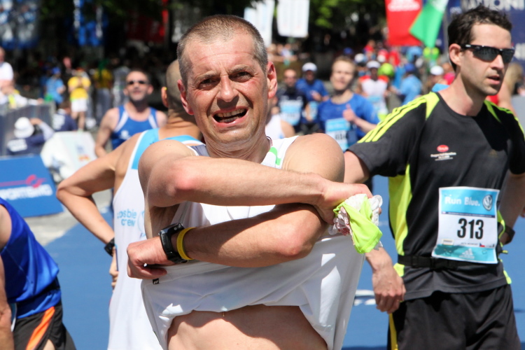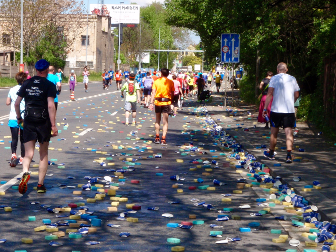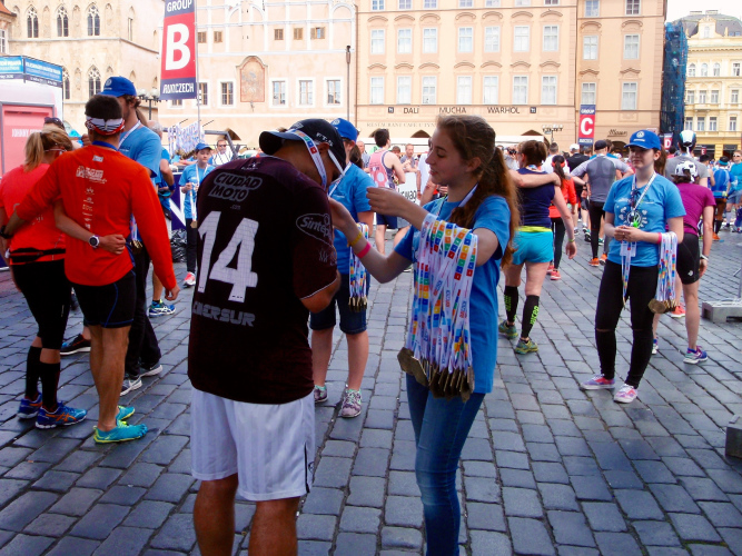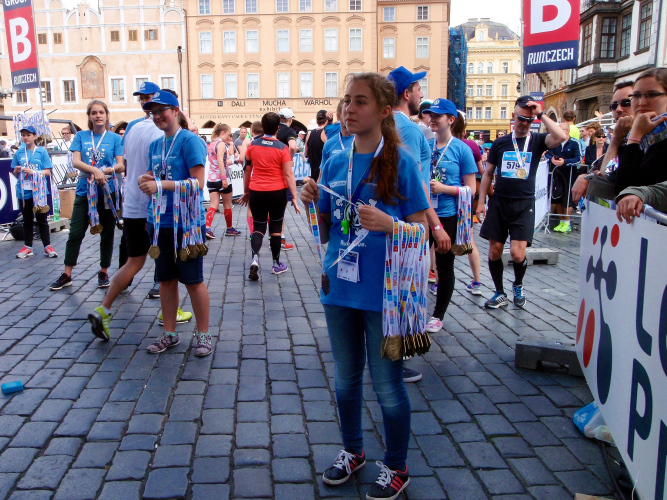 Zweieinhalb Stunden später: Am unteren Ende des Wenzelsplatzes haben bereits die Aufräumarbeiten angefangen, aber mit meiner Medaille bekomme ich trotz inzwischen „theaterfeiner Kleidung“ noch ein Bier und sogar binnen kaum zwei Minuten die Medaillengravur. Dafür, dass ich überhaupt nicht fit war, ist 4:58:01 eine tolle Zeit.