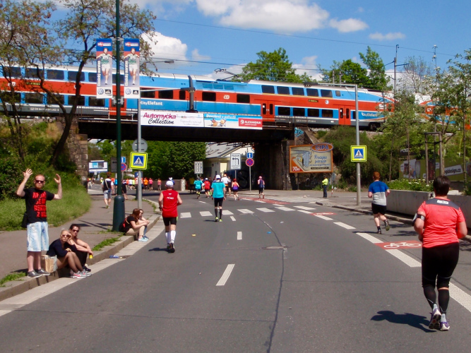 Kurz hinter dem Nationaltheater ruft mich Thomas aus Münster aus meinen Erinnerungen wieder zurück in Marathonwirklichkeit: „Mach mal ein schönes Bild von mir und meiner Frau!“ Kein Problem: Ich lege einen kurzen Sprint bis hinter eine Querstraße ein, welche den ansonsten von prächtigen Häusern gesäumten Uferboulevard kurz ins Sonnenlicht taucht: Das Bild gelingt in der Tat, prächtig mit dem Nationaltheater im Hintergrund! Kurz danach kommt auf der linken Straßenseite, wo wir laufen, das Kilometerschild 16, während die hier entgegen kommenden Läufer bereits auf die 24 treffen. Es folgt allerdings keine vier Kilometer lange Wendestrecke, sondern es geht für uns gleich darauf links in ein Seitental des Moldautals hinein, immer längs einer Eisenbahnstrecke. Auch wenn Prag hier im Tälchen des Botič eigentlich kein touristisches Ziel ist, ist es hier recht nett, und selbst die zweimal unterquerte Schnellstraße, unter deren Brücke auch die „rote Metrolinie C“ eingehängt ist, stört kaum, weil sie viele Dutzend Meter höher verläuft.