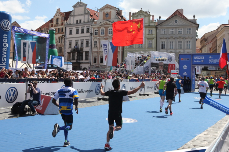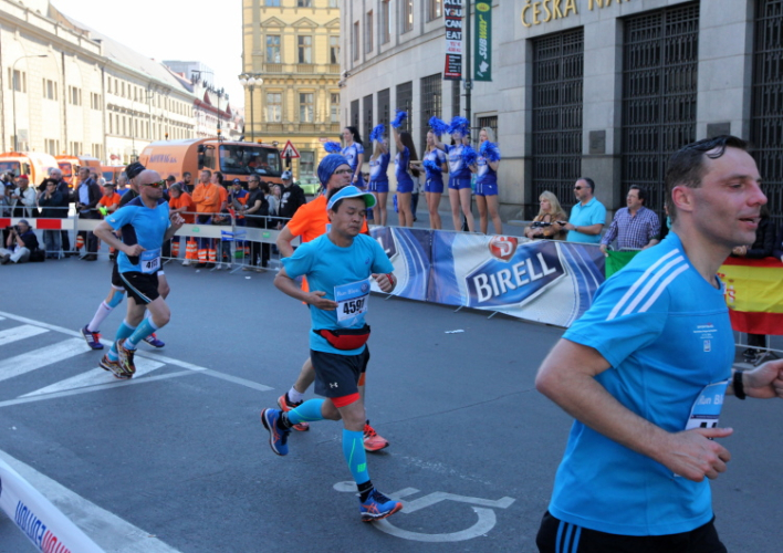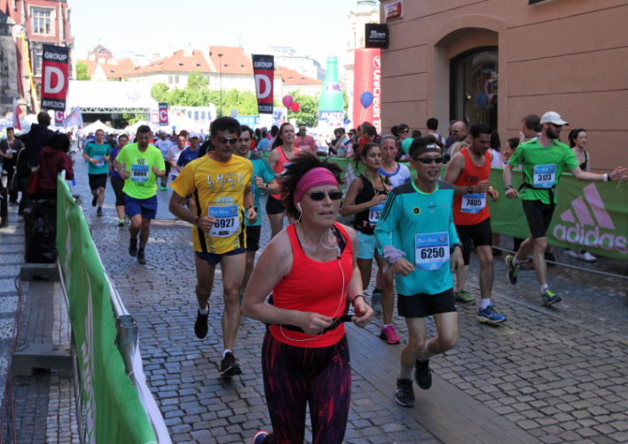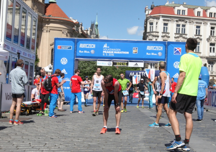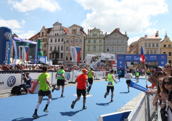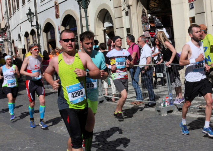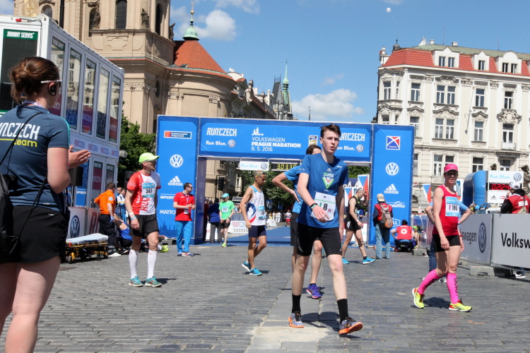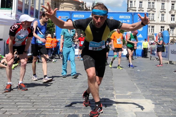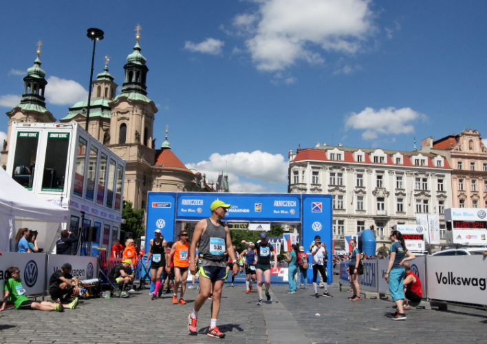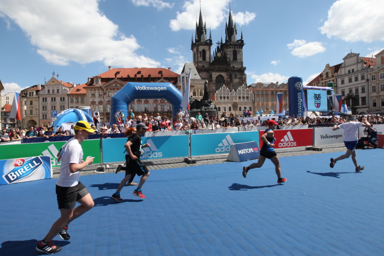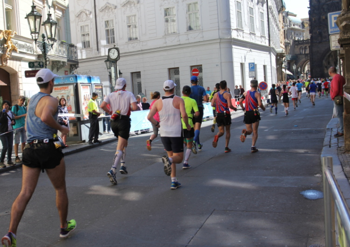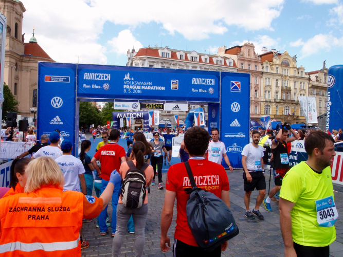 Trotz kurzen Gehpausen tut es gut zu wissen: Gleich ist es geschafft. Und einen Kilometer vor dem Ziel bin ich noch so klar im Kopf, dass ich merke, dass ich durchlaufend problemlos das Ziel sub fünf Stunden erreichen werde. So ist der dritte Lauf über die Pařížiská zum Altstädter Ring – zum zweiten Mal in dieser Richtung – ein Hochgenuss. Welch ein Zieleinlauf – immer noch herrscht auf dem Platz eine Riesenstimmung!