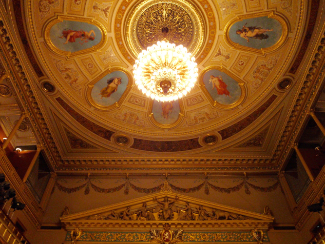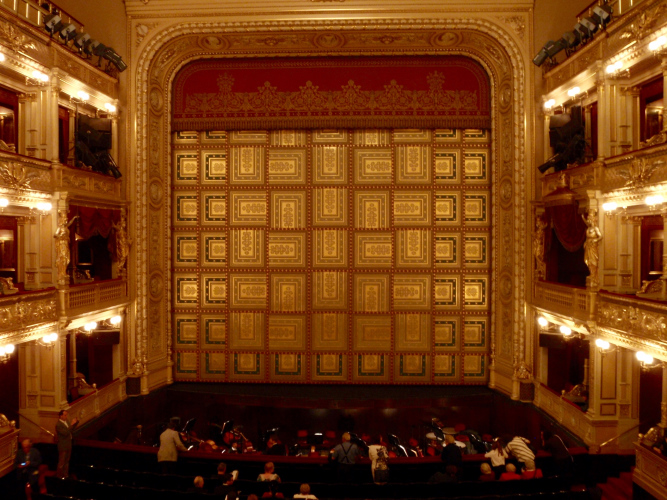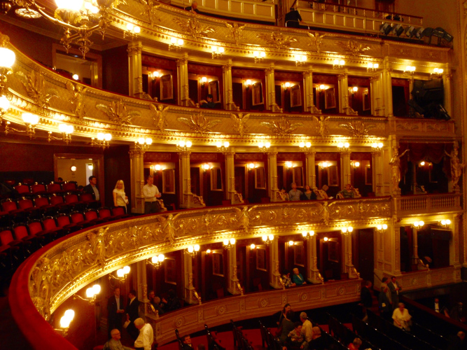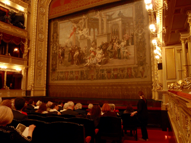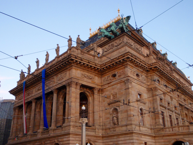 Und ich habe mich damit nicht zu sehr verausgabt. In einer Loge des Nationaltheaters habe ich während der gut zweieinhalbstündigen Aufführung von „Libuše“ zwar Angst vor Krämpfen, weil ich die Beine nicht ausstrecken kann, aber ich bin überraschend frisch und im Kopf kein bißchen müde. Während die herrliche Musik von Smetana auf Weltklasseniveau das Theater flutet, denke ich daran, wie wir vor wenigen Stunden den Libuše-Felsen des Vyšehrad zweimal durchquert und beim Rückweg zu den hohen Befestigungsmauern über der Moldau hinaufgeschaut haben.