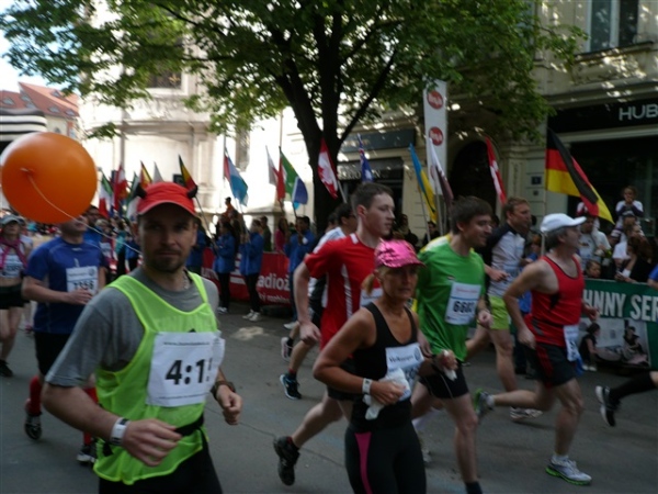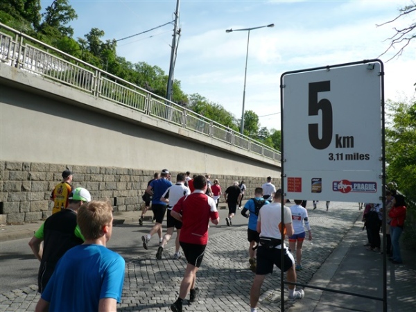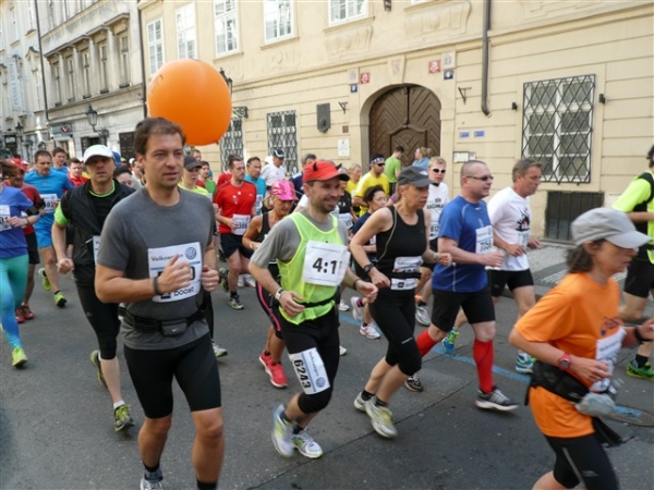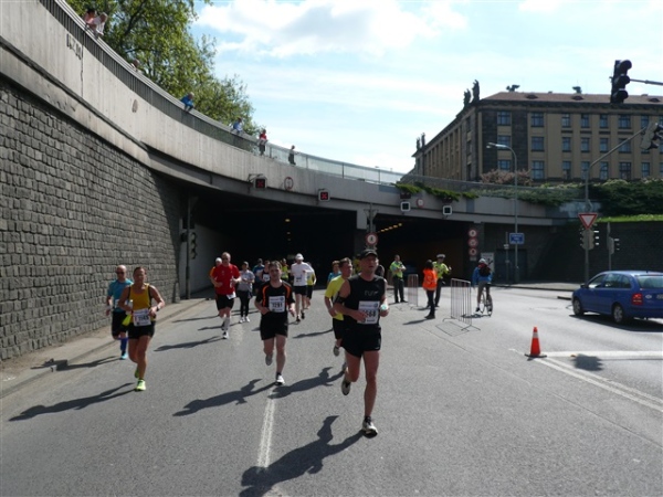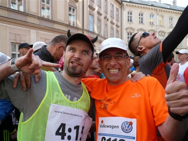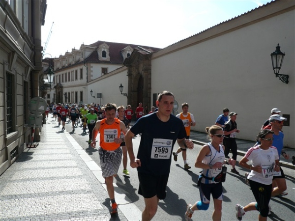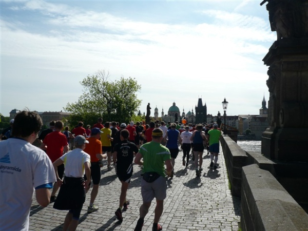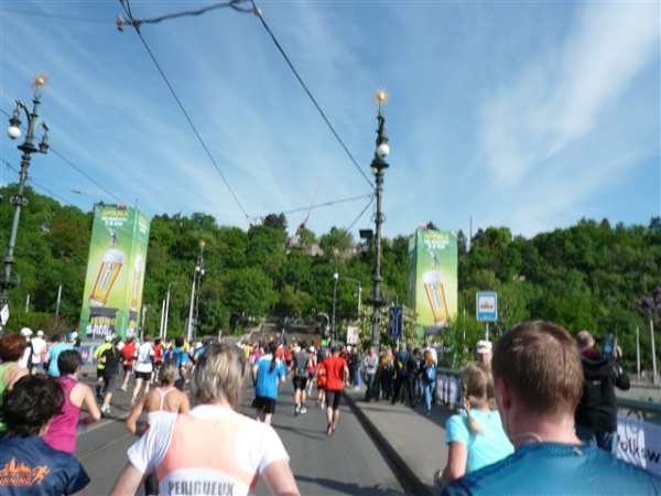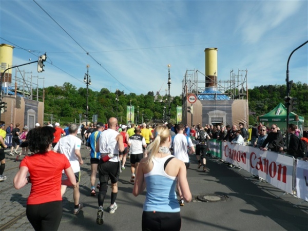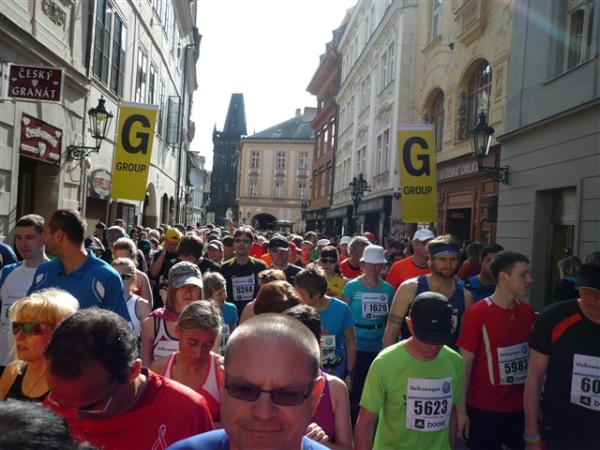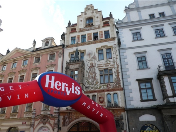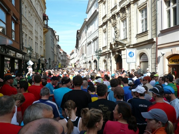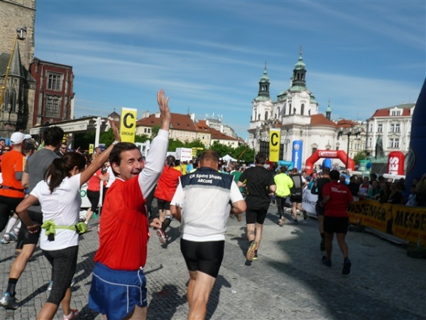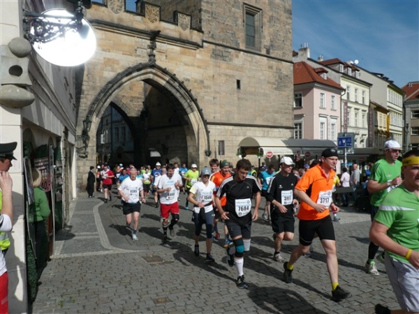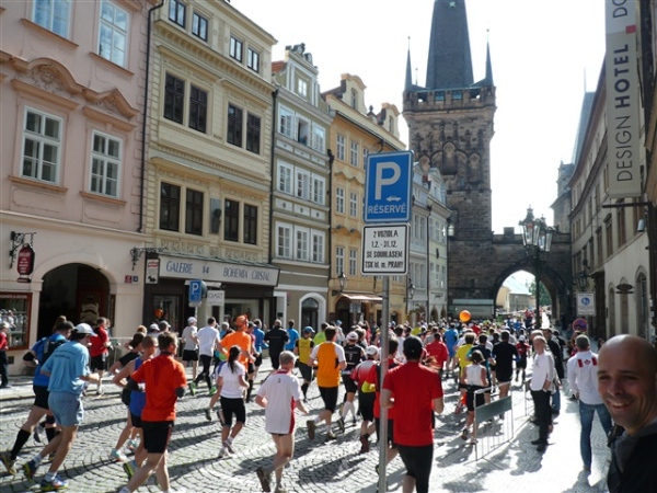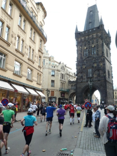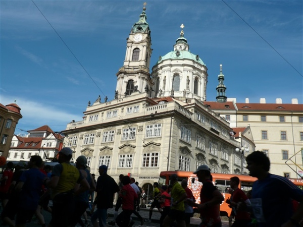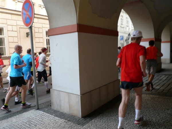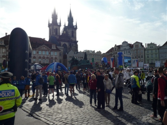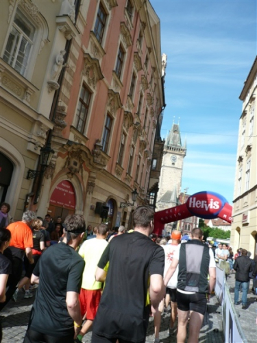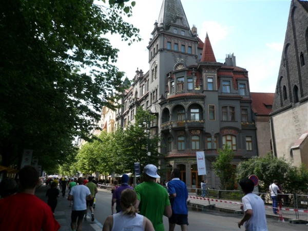 Nach einem weiteren Kopfsteinpflaster-km (viele davon werden wir genießen dürfen) gibt’s auf dem zwölften ein Déjà-vu, denn auf der Prachtstraße Parizska (der teuersten Prager Einkaufsstraße) sind wir losgelaufen, allerdings in umgekehrter Richtung. Traumhafte Fassaden säumen unseren Weg, ich schwelge in optischen Eindrücken. Auf dem Altstädter Ring, dem schönsten und ältesten Platz der Stadt (seit dem 12. Jahrhundert), laufen wir unmittelbar am Startbogen vorbei. Es steppt der Bär, viele Zuschauer sorgen für den immer wieder gerne erlebten Schub von außen. Es ist nicht einmal ausgeschlossen, daß ich den/die eine(n) oder andere(n) kennen könnte oder vielleicht sogar sollte, weil er/sie mit mir verwandt ist. Denn die beiden Schwestern meiner Oma sind, eine mit einem Tschechen, die andere mit einem Österreicher verheiratet, geblieben und haben für weitere Nachkommen gesorgt, die ich nicht kenne. Es ist schon verrückt, wenn man darüber mal in Ruhe nachdenkt.