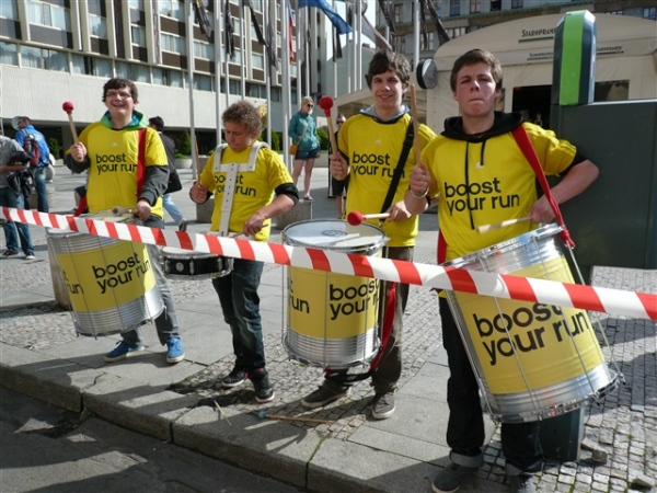 Die erste Verpflegung wird uns nach den üblichen fünf km gereicht. Es gibt Wasser, Iso, Bananen, Orangen und Zucker. Ich spiele meine ganze Erfahrung aus und steuere nicht den ersten Tisch an, auch nicht den zweiten. Das können die Anfänger machen und sich um die Becher balgen. Ganz überlegen und ruhig warte ich so lange, bis ich am letzten Tisch vor der Wasserwanne für die Schwämme stehe. Ich Depp. Panik kommt auf, was soll ich machen bei der zu erwartenden ordentlichen Wärme? Ich kneife die Pobacken zusammen und laufe weiter in der Hoffnung, das Versäumte später nachholen zu können. Der Fauxpas hat glücklicherweise keine negativen Auswirkungen.