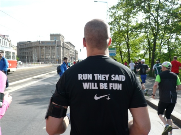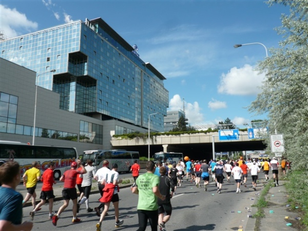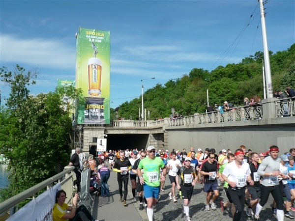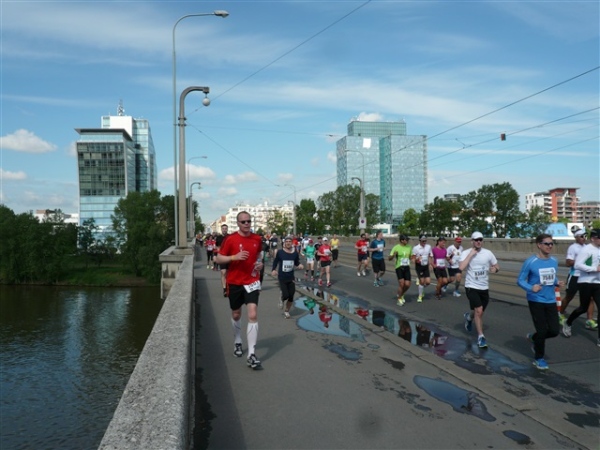 Drei km schwelge ich in der Beobachtung der verschiedenen Läufer (zugegeben, auch Läuferinnen) in ihren höchst unterschiedlichen Zuständen von locker entspannt bis Teilnehmer am Zug der lebenden Leichen. Die Palackého most ist die fünfte der von uns zu überquerenden Brücken, die uns an das gegenüberliegende Ufer führt, an dem wir wieder nach Süden einschwenken. Ja, viele km legen wir heute auf Pendelstrecken am Wasser zurück, aber mir gefällt das. Demnächst werde ich wieder einsam durch die Natur rennen, Abwechslung ist Trumpf, auch diese Verschiedenartigkeit macht doch den Reiz unseres Sports aus. Immer nur Gebolze auf der 400 m-Bahn mit der Stopuhr in der Hand?