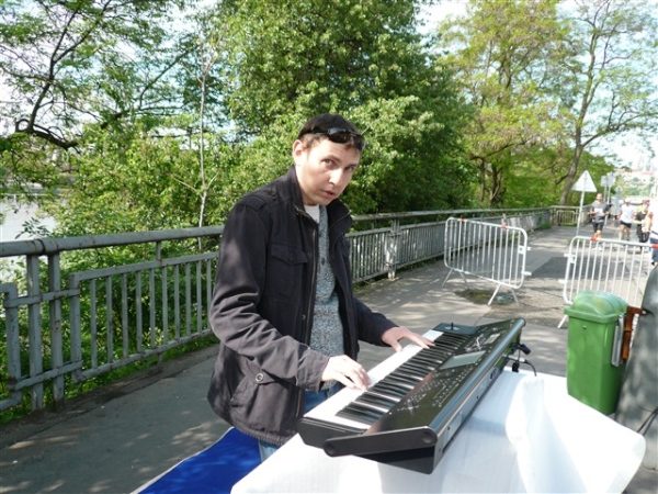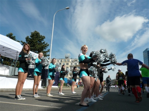 Gegenüber unserem Hotel lichte ich die zweihundert Meter Luftlinie entfernt liegende doppeltürmige St. Antonius-Kirche am Strossmayerplatz ab, in der mein Papa Meßdiener war und nur einen Steinwurf entfernt wohnte. Natürlich war ich bereits gestern als allererstes dort und auf seinen Spuren unterwegs gewesen. Die leckeren Cheerleader, zwischen denen René natürlich hindurchtoben muß, bringen mich wieder auf andere Gedanken. Nach siebeneinhalb km haben wir das nördliche Ende des Kurses erreicht, überqueren auf der vierten Brücke (Liebenbrücke, Libeňský most) erneut die Moldau und nähern uns ganz langsam wieder dem Start- und Zielbereich.