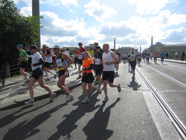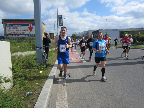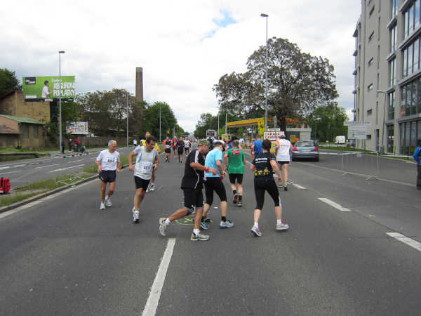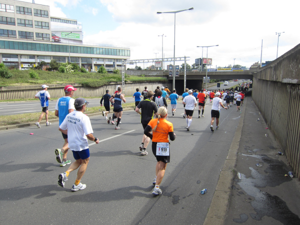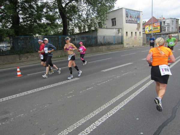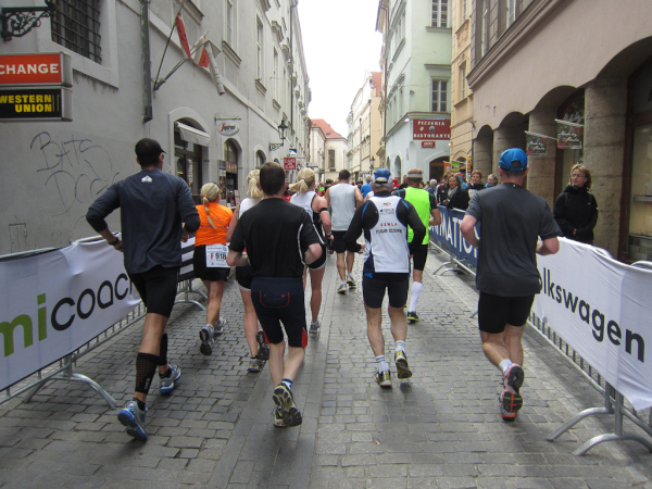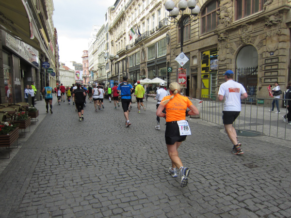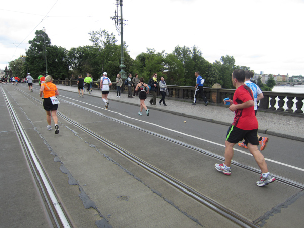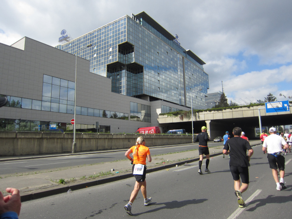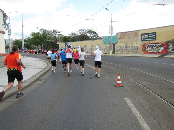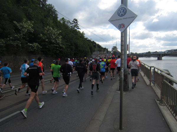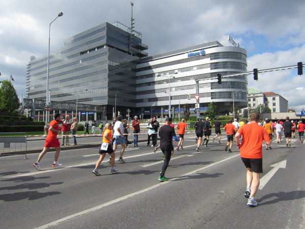 Right after passing the Dancing House we come across the runners faster than us as they already return from an turnaround area. We are on the left, they are on the right side of the road. I like to watch other tantalized faces, because they make me forget my own pain. Unfortunately this parallel running is not for long.