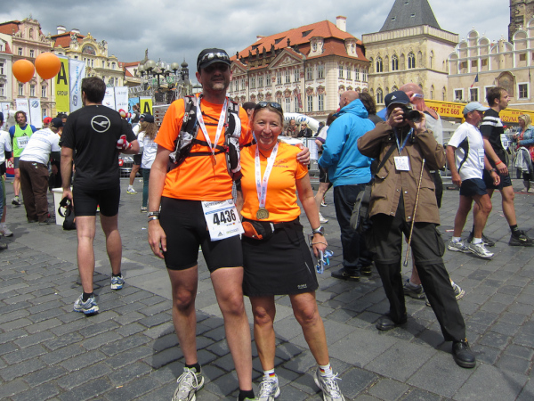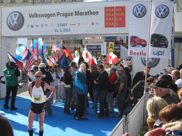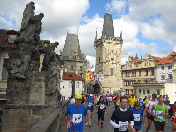 I asked myself, is this all too much history and too much culture for a race report? Where shall I begin? Maybe I should start with what we all already know about the city. For me Prague always was the gentleman in a Stresemann wearing a white carnation on the lapel and carrying a black umbrella. He just had to tap on his magic bowler hat to be able to change his appearance into a puppet, to conjure up miscellaneous objects or to do other magic. In addition to that I remember Karel Gott singing about traveling the world with the pockets full of money. However, we are now on our way to the fairground to pick up the participants documents and a backpack for the crace-day baggage drop off as well as the event shirt.