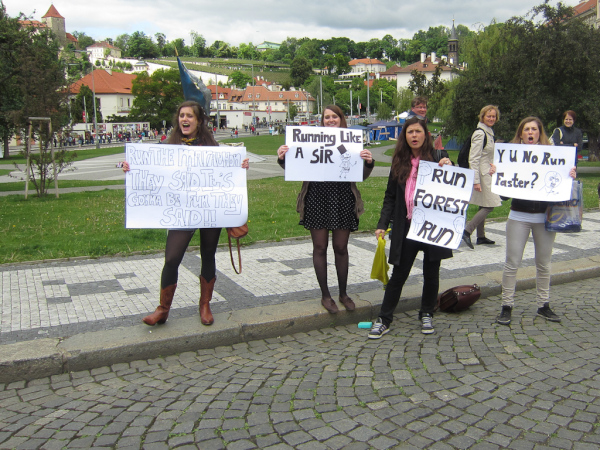 Now, here and there one can catch a glimpse on some runners. But this is about to change within the next few hours. Prop master appear in order to turn the square into an arena, rolling out a blue carpet while tourist morph into athletes. Oversize full-colored poster at the house walls announce the upcoming sporting event that is going to start in a few hours: The 18th Prague Marathon.