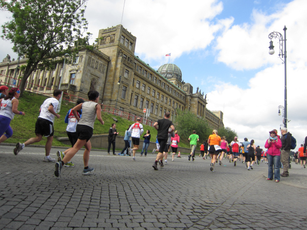 One forth of the whole course needs to be run on cobblestone streets and so do we now run along the winding alleys back to the Old Town. As we reach kilometer 11 at the Tesnovsky Tunnel another band is heating up the athletes. Because of the Tunnel's proximity to the former communistic headquarters while being built, the 360 meter long tube is also known as Husak (Minute's silence). From here one can see a floating disco rocking on the Vltava as well as towed hotel ships. We again run across the grand boulevard of Pařížská Street back to the Old Town passing the vanguard modern theater “Laterna Magika” which is connected to the National Theater.