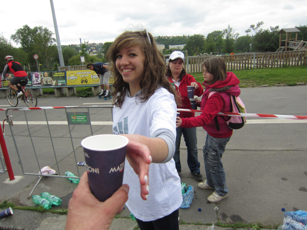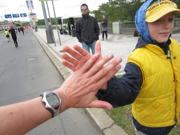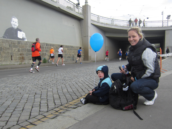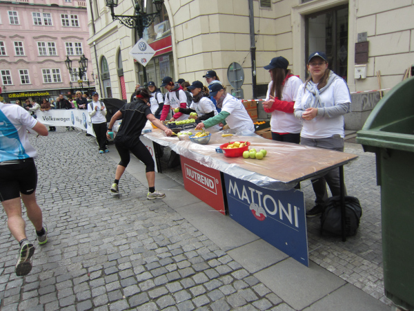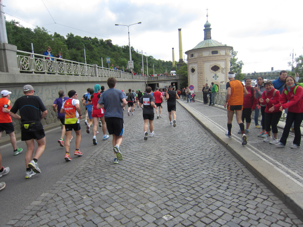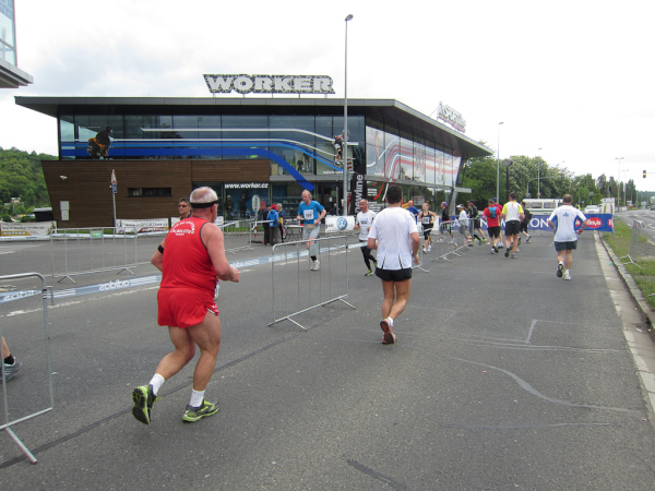 At Kilometer 20 the relay teams have to hand the baton to the next runners. A few moments later we pass the half-marathon distance and reach another turnaround area, so we have to run back to the Palackého most and again cross the Vtlava and the riverside road.