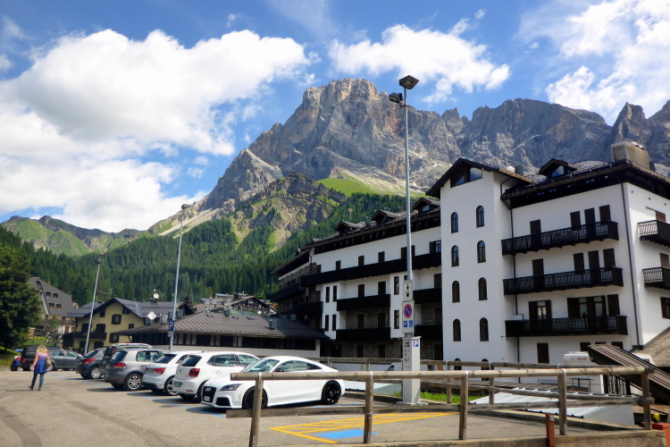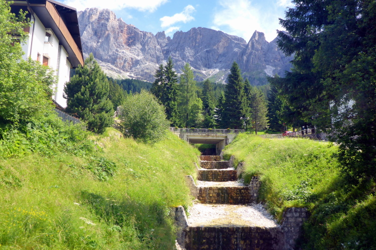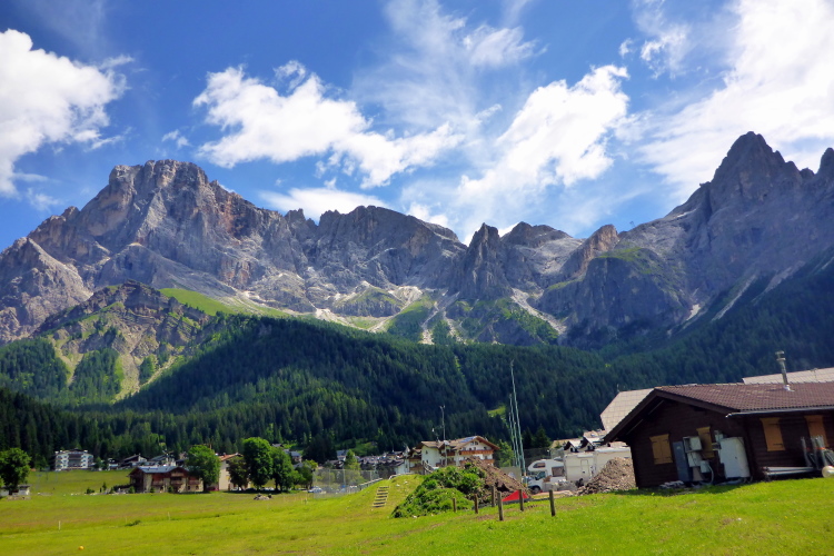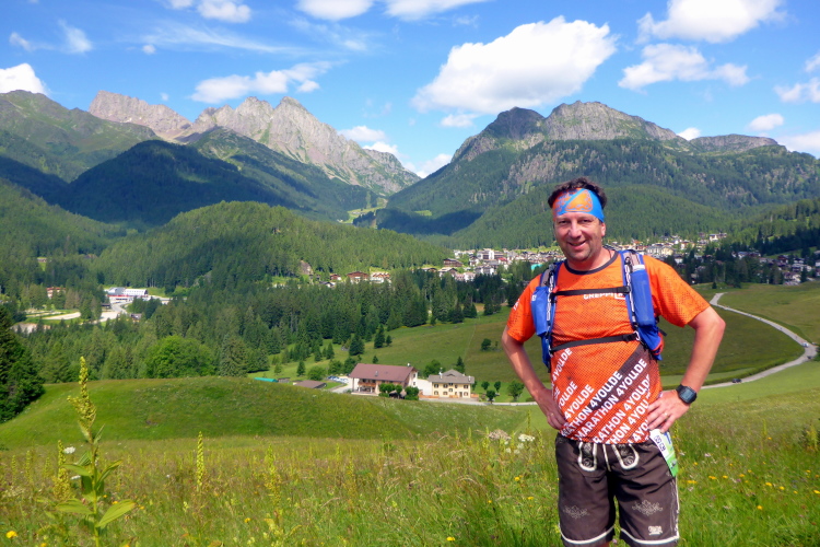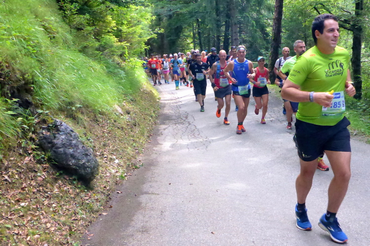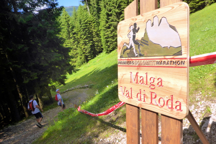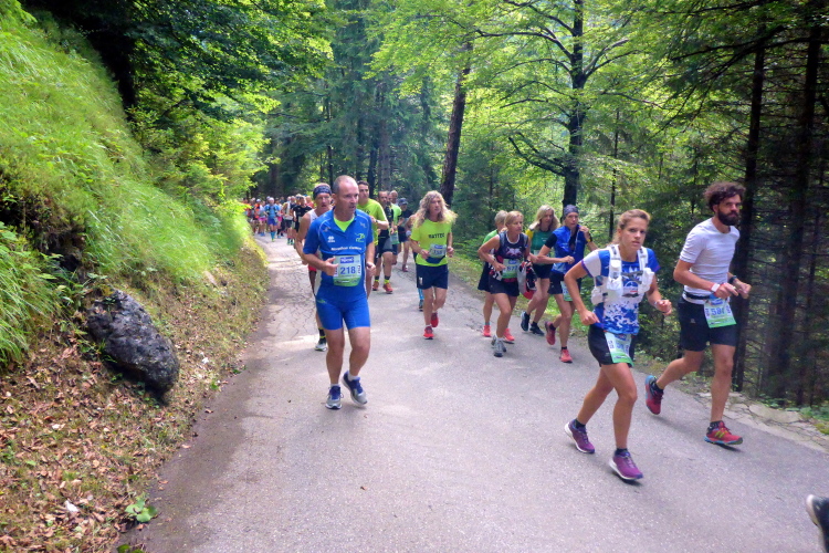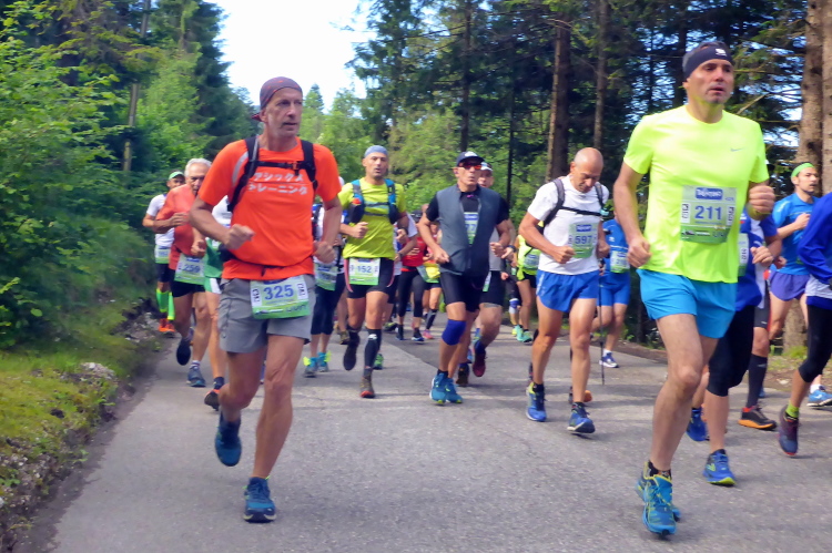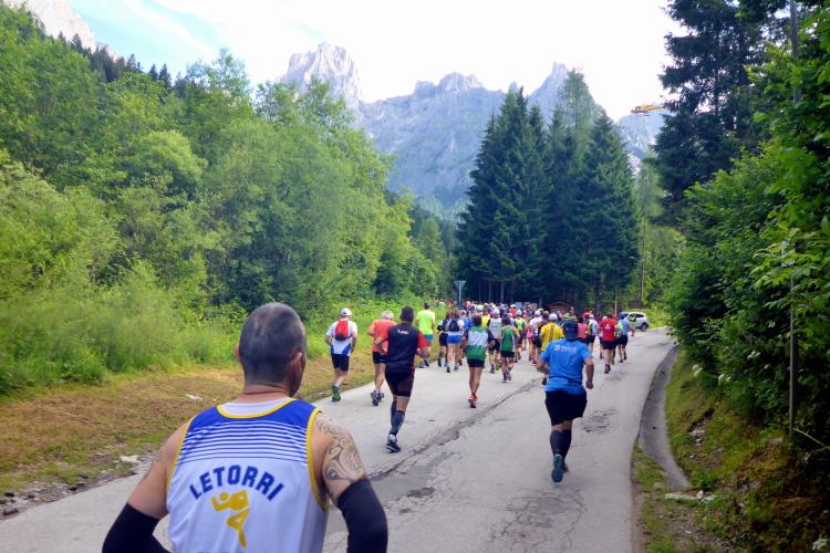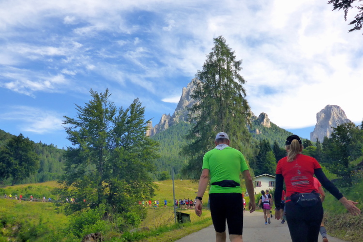 „Pünktlich um 8:45 Uhr geht es los. Zur Einstimmung geht es sanft bergauf über eine frisch geteerte Bergstraße. Da kann man gut überholen und sich in die Läuferschar einordnen. Nach zwanzig Minuten erreichen wir auf einer kleinen Ebene einige Hotels, deren Gäste uns anfeuern. Die ersten 16 Kilometer laufen wir am Rande der Pala di San Martino-Dolomiten entlang. Immer wieder bieten sich beeindruckende Ausblicke auf die schroffen Kalkgesteinsfelsen. Dort finden Kletterer viele Herausforderungen.“