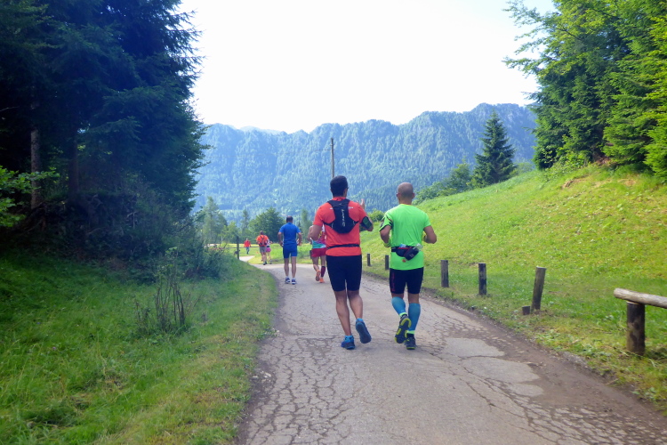 „Grüne Wiesen liegen vor uns, Kühe grasen und liegen relaxed in der Sonne. Mann, haben`s die gut. Ich will etwas Tempo machen, lass es aber sein. Der Weg ist zu schlecht und die Landschaft zu schön. Wir sind im oberen Valle del Vanoi, vor uns liegt der malerische Calaita-See und die großartigen Türme der Pale di San Martino. Eine einmalige Naturkulisse. Klar, hier lauert ein Fotograf am Streckenrand, um die Teilnehmer abzulichten. Am Calaita-See erreiche ich Kilometer 25 und die nächste Verpflegungsstation. Ich mische Iso mit Wasser und lasse mich für ein paar Minuten auf einer Bank nieder. Ich muss das einfach genießen. Fantastisch.“