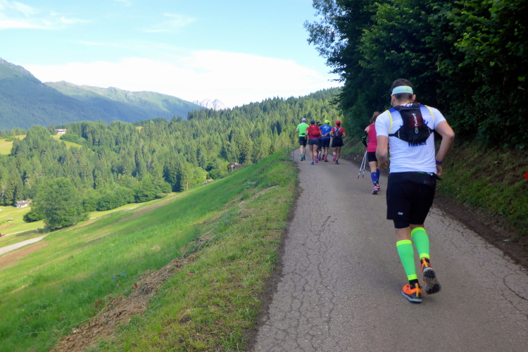 „Nach ein paar hundert Metern haben dann die ersten Läufer ihr Pulver verschossen und ich kann mit ihnen gemeinsam stramm weiter marschieren. Als wir schon bald den Wald wieder verlassen, liegt ein kleines Bergdorf vor uns, umgeben von grünen Wiesen, im Hintergrund die Palagruppe. Genial. Schöner könnte es gerade gar nicht sein.“