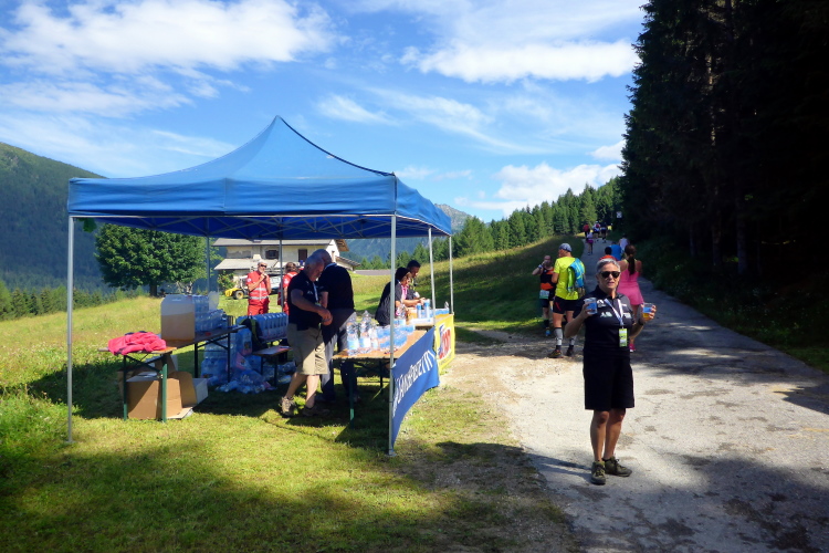 „Schon nach zwei Kilometern ist die Traileinlage wieder vorbei. An der Verpflegungsstelle Ronzi heißt es auftanken. Die VPs gibt es alle vier Kilometer. Wasser, Iso, später Cola, Bananen, Rosinen, Keksen sind im Angebot. Es wird darauf geachtet, dass man die Becher vor Ort austrinkt und in die dafür vorgesehenen Sammelbehälter wirft.“