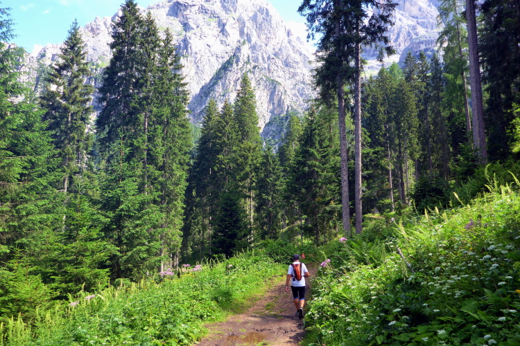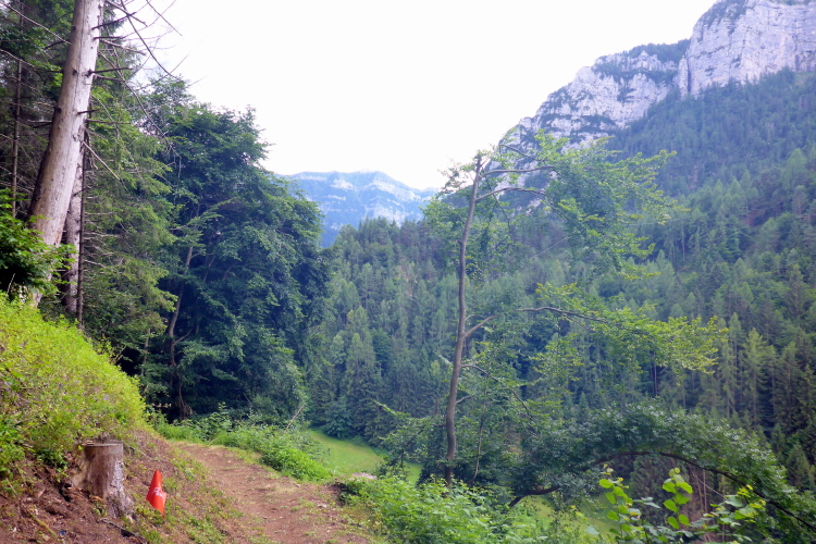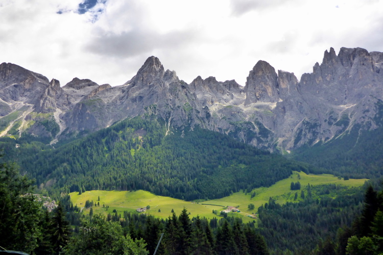 „Auf dem nächsten Streckenabschnitt bis zur Verpflegungsstation bei Kilometer 12 ist es ganz ähnlich, breite Waldwege, Trails und Geröllhalden wechseln sich ab. Und immer geht es bergauf und bergab, jetzt wieder durch ein Waldstück. Zunächst sieht man die Felszacken der Pala nur zwischen den Bäumen, dann in ihrer vollen Pracht hinter grünen Wiesen. Es ist einfach spektakulär. Wir laufen hinab in Richtung San Martino di Castrozza. Gut 16 Kilometer haben wir zurückgelegt.“