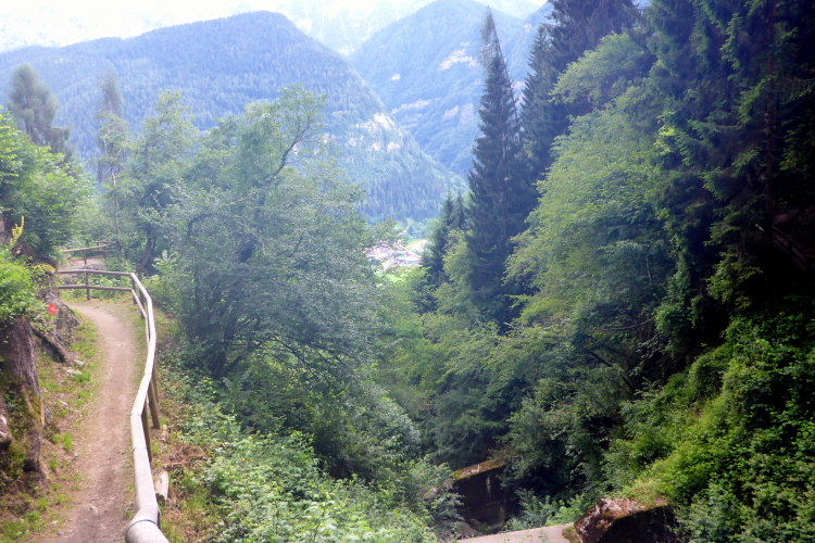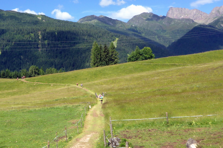 „Weit unten im breiten Tal sieht man ein Dorf. Wir sind nun anscheinend wieder im Haupttal und laufen direkt auf das Ziel zu. Noch sechs Kilometer. „Ultima salita“ - letzter Anstieg - verkündet ein Plakat. Die ersten Almen sind erreicht und über eine Wiese geht es bergab. „Discesa pericolosa“ , ein gefährlicher Abhang, erwartet uns nach der nächsten Kurve. Was aber eher als Hinweis für die ganz schnellen Läufer taugen dürfte.“