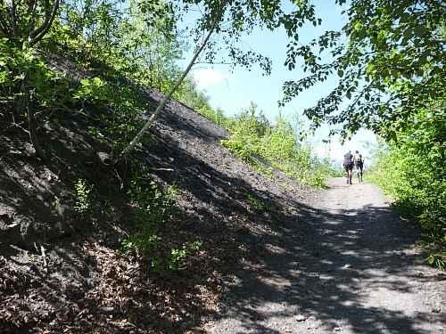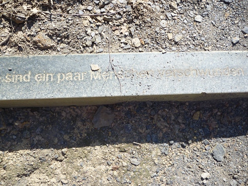 Hinauf geht es zur Halde Grühlingstraße (1957-1967). Surreal sieht das steile Ding mit seinen tiefen Erosionsrinnen aus. Den steilen Aufstieg kann man sich durch die Lektüre von Fragmenten aus „Die Kinder der Toten“ von der Literaturnobelpreisträgerin Elfriede Jelinek verkürzen. In 14 Steinschwellen sind Textausschnitte eingraviert, wie: „ ...die im Grunde wenig hervorbringen, aber viel kaputtmachen, im Gebirge sind ein paar Menschen verschwunden.“ Ich bin benebelt, aber die Textauschnitte sind nicht schlecht, ich werde mir das Buch besorgen.