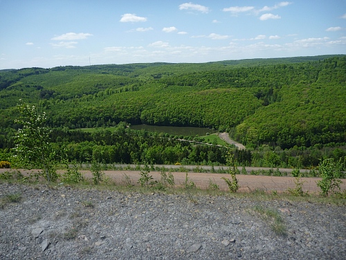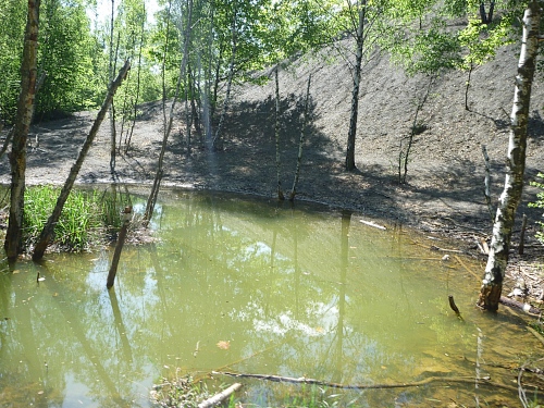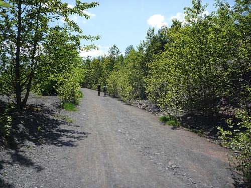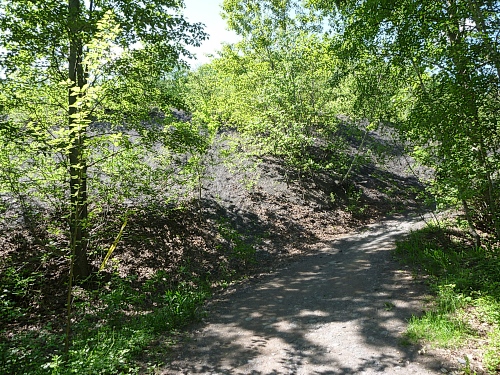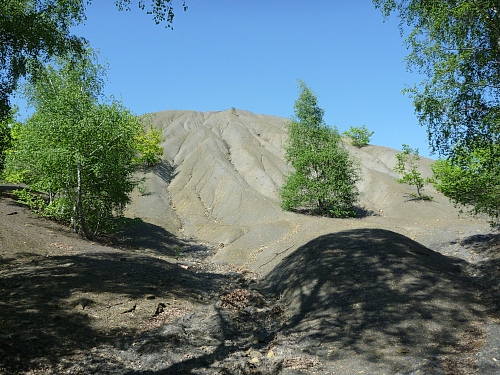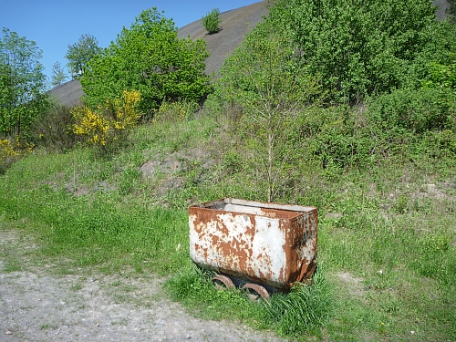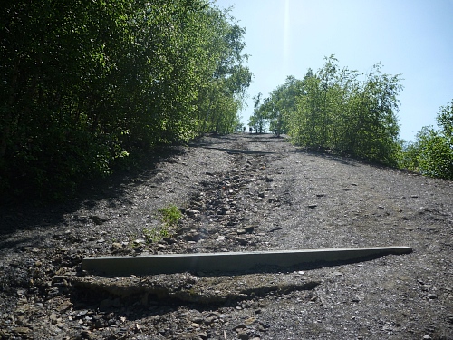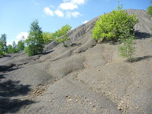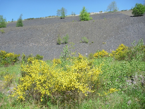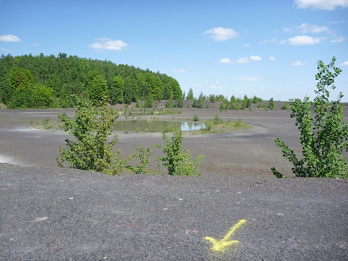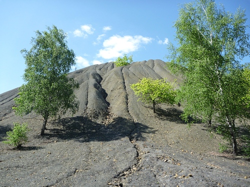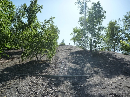 Letztes Jahr brannte diese Halde, deswegen liegen hier noch für den Notfall die Schläuche. Gerade in diese Spitzhalden dringt der Sauerstoff zu einfach ein, die Kohlereste (20%), in denen Phospor enthalten ist, können sich dann selbst entzünden. Die Umweltbelastung eines solchen Brandes, der über 100 Jahre dauern kann, ist enorm. Das Löschen dauert Monate und ist wegen Verpuffungs- und Explosionsgefahr gefährlich. Zurzeit brennen in Deutschland mindestens neun Steinkohlehalden, einige Brände bleiben sogar unentdeckt. Bei den hohen Temperaturen (mehr als 500 Grad) entstehen interessante Minerale, die auch gerne als Baumaterial genutzt werden. Eine geothermischen Nutzung alter, brennenden Halden erscheint irgendwann möglich. Auch für die Erforschung dieser „alternativen“ Energiequellen nutzt man Subventionen.
