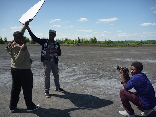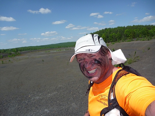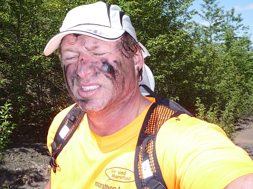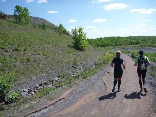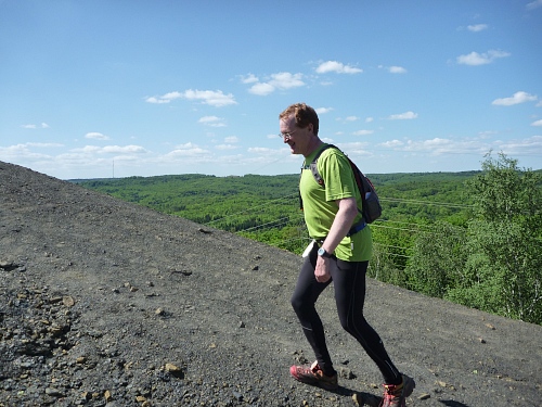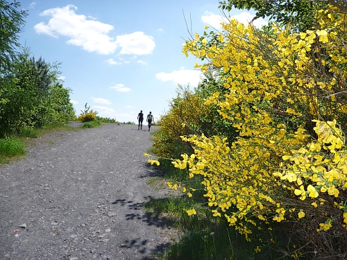 Steil geht es hinauf auf das Plateau der Halde Lydia. Diese Halde ist noch atemraubender, irgendwie erschreckend monströs und doch von Menschenhand geschaffen. Auch einige Spaziergänger genießen diesen beeindruckenden Ort. Schwarzafrikaner machen eine Fotosession hier oben, schauen mich wegen meiner Kohlereste im Gesicht ungläubig an. „Black is beautyful, men!“ Dann wetze ich weiter, ehe mich ein Ovambopfeil trifft.
