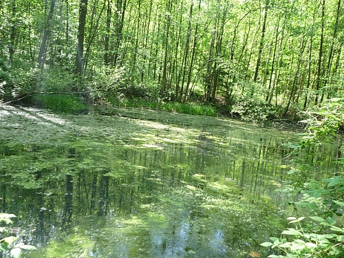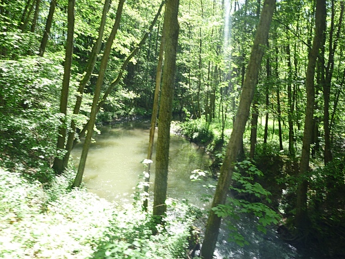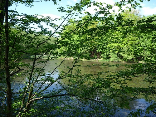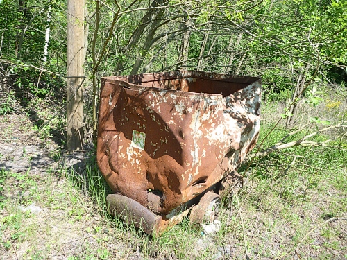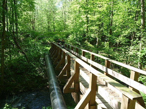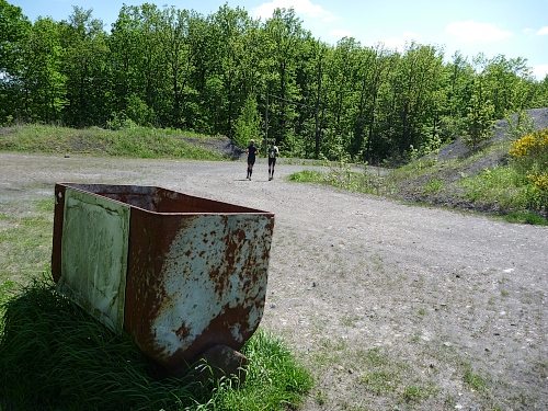 Vorbei am alten Schwimmbad (1924) mit dem Brausepilz und dem ovalen Kinderbecken. Ich habe aber keine Kraft mehr, um für ein Foto dort hinabzusteigen. Es sind unglaublich viele Eindrücke, von tiefen, urigen Schluchten, eigenartigen Schauspielen, glitzernden Teichen und sumpfigen, von Wildschweinen durchgepflügten Niederungen, wo sich unter ölig flimmernder Oberfläche neue Kohle bildet. Wirklich ein fantastisches Laufbilderbuch aus einer anderen Zeit.