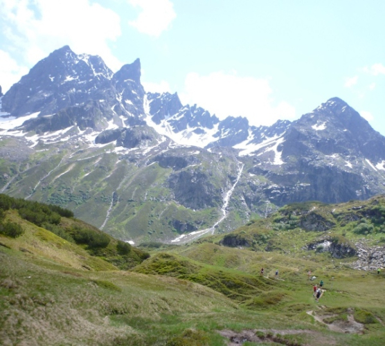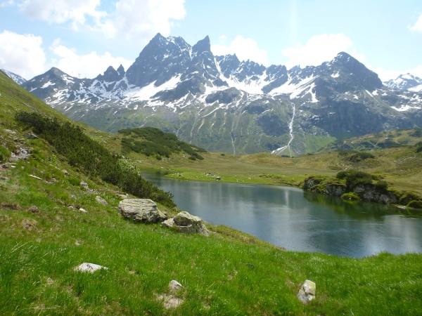 Im Süden zeigen die höchsten Punkte des Valschavieler Maderer, Frastafaller Spitz, Giampspitze und Fanesklakopf allesamt weiße Hauben. Das ganze toppt jedoch gerade vor uns das wilde und gezackte Massiv des Patteriol. Mit 3056 Metern ist er zwar nicht der höchste Punkt des Verwall, aber der beeindruckenste Gipfel, wenn man sich von Norden oder von Westen (wie wir) annähert. Als normaler Wanderer ist der Patteriol nicht zu bezwingen. Da brauchst du meist Bergführer und Ausrüstung, denn Klettern und Orientieren ist da angesagt. Den Hohen Riffler (3168 Meter) als höchsten Punkt des Verwall kann der geübte Bergwanderer bei günstigen Verhältnissen erwandern.