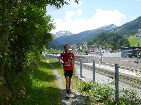Auf einem Almwiesentrail laufen wir abwärts. Auch danach ist es steil und der Riesel auf dem Weg kann dir fast die Füße wegziehen. Wir wechseln die Talseite und sammeln so noch die fehlenden Kilometer irgendwie ein. Beim kurzen Begegnungsstück auf einer Wiese parallel zur Rosanna wird sich eifrig gegrüßt, wohl wissend, dass der Kanten gleich geschafft ist. Wie weit es noch genau ist, weiß ich nicht. Kilometerschilder habe ich nicht mehr gesehen. 40 Kilometer werden es sein. Den anlässlich der Skiweltmeisterschaft 2001 verlegten Bahnhof sehen wir von der Bergseite, denn hinter diesen packen wir den letzten Kilometer an. Oder sind es noch zwei? Sicher bin ich mir nicht.