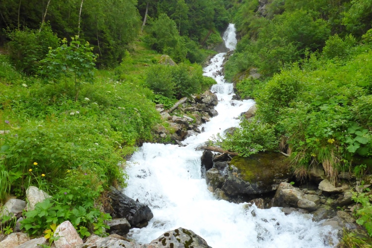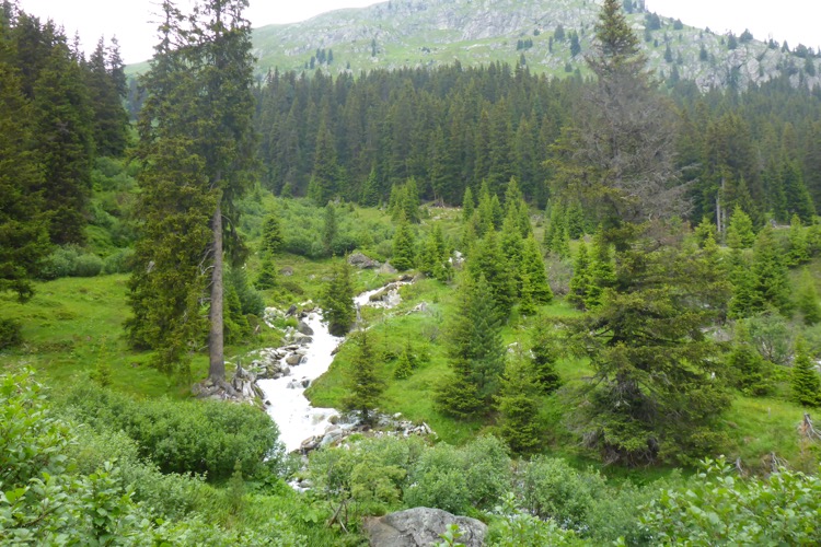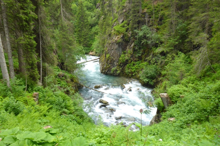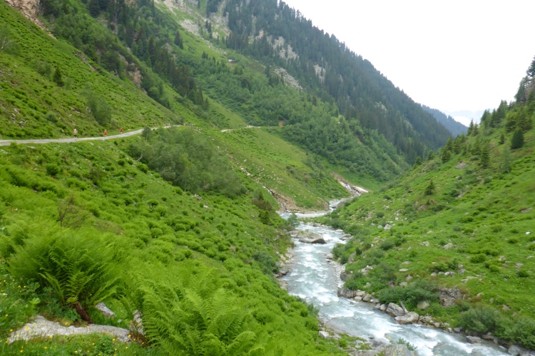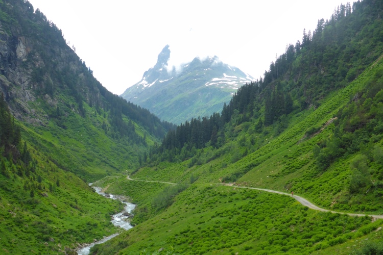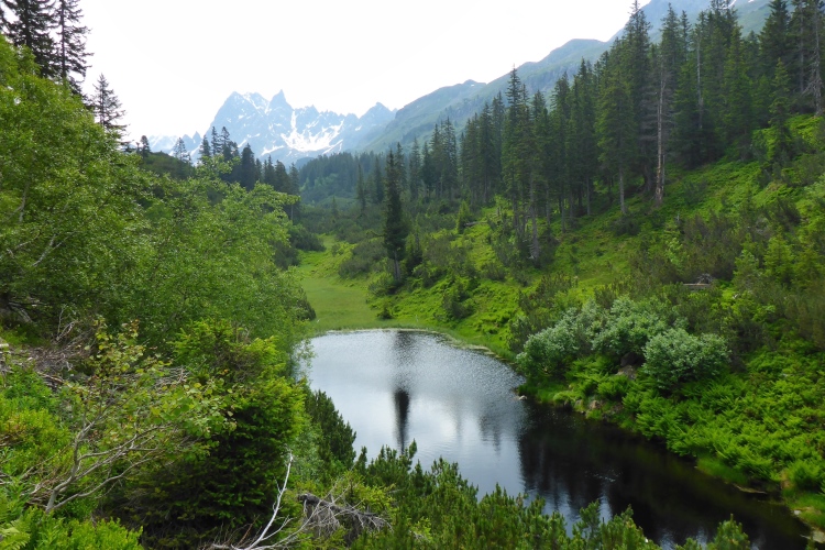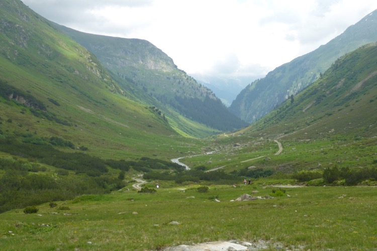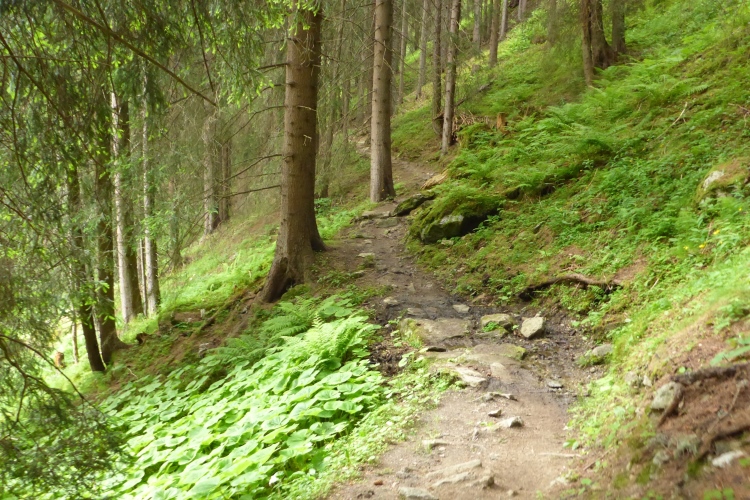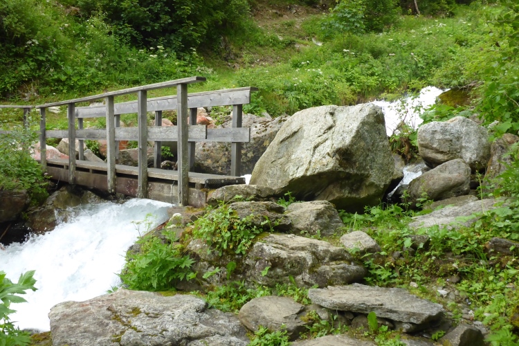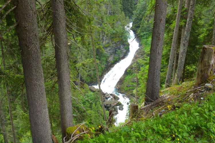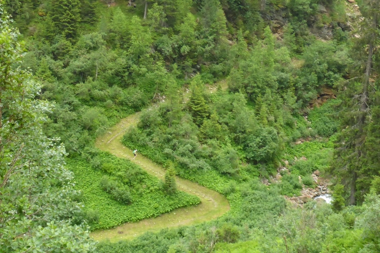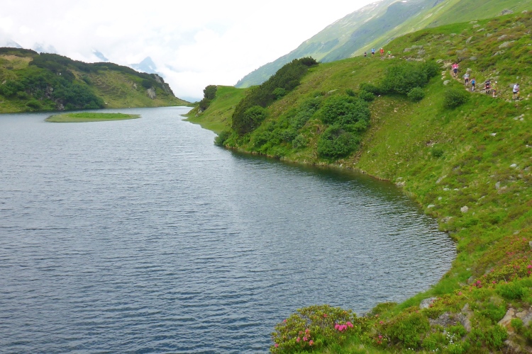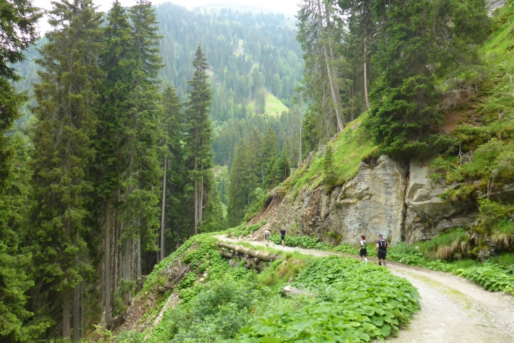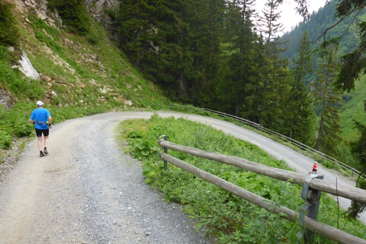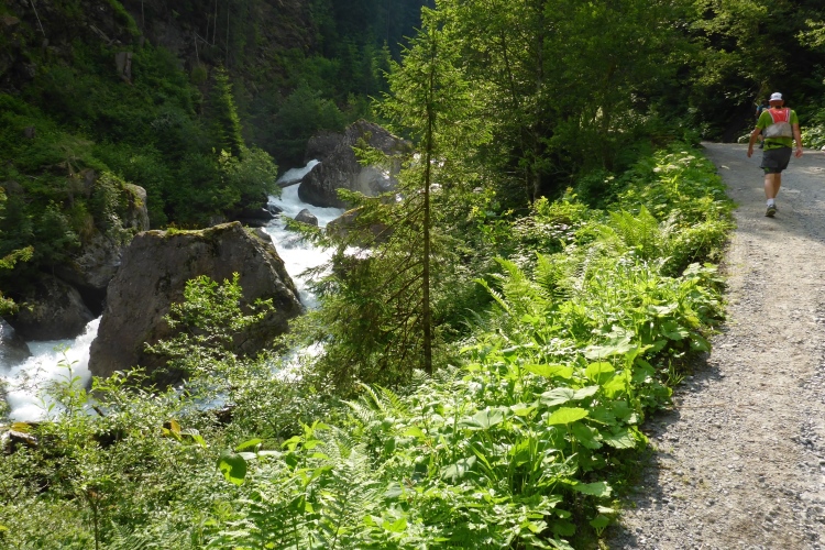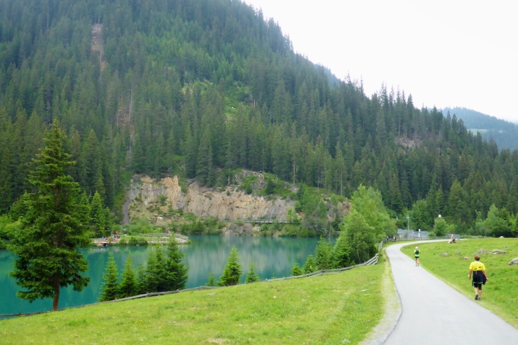 Allmählich wird die Vegetation am Wegrand vielfältiger und dichter. Ein schneller Weg führt entlang des Rosanna-Bach durch das Verwalltal. Nach einem kurzen Zwischenaufstieg kann ich auf dem Weg mit einigen Serpentinen flott bergab laufen. Zu sehen ist der Verwall-Stausee, der zur Energiegewinnung angelegt wurde. Dann führt ein breiter Weg oberhalb der Rosannaschlucht entlang, in die ich nur kurz hinab blicken kann.
