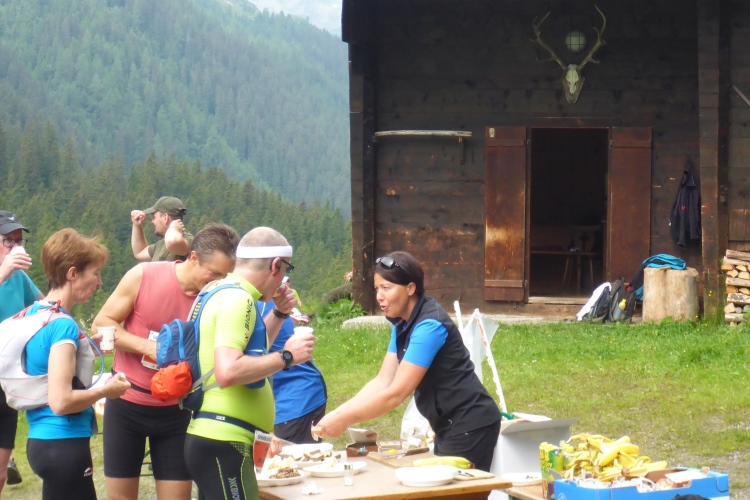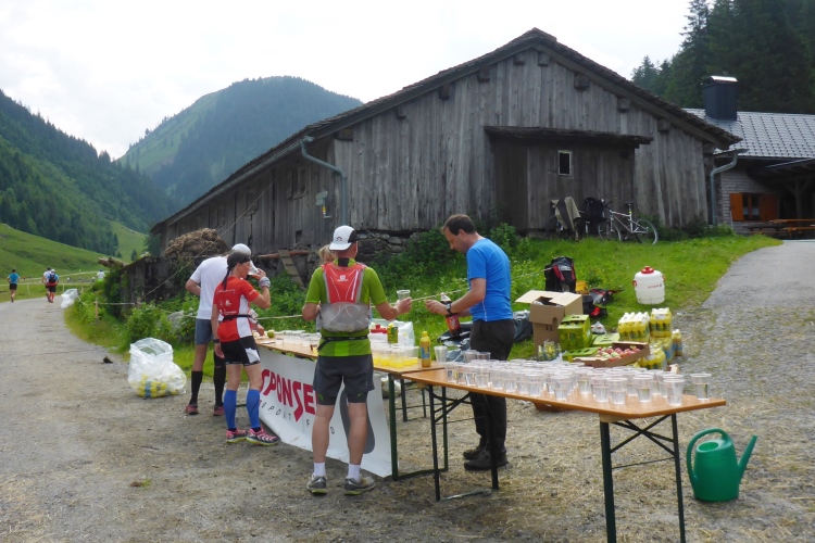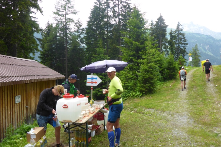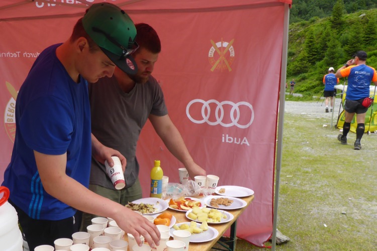 Ich habe bei bisher fast 80 Marathons und Ultratrails schon viel gesehen und erlebt, aber es gibt immer wieder Neues und Originelles. Eine Verpflegungsstelle, bei der das Wasser aus großen, grünen Gießkannen, wie ich sie nur vom Friedhof kenne, in die Becher geschüttet wird, ist da ein Beispiel. Das sollte patentiert werden! Nach dem gleichen Prinzip wird auch an den anderen Verpflegungsstellen gearbeitet. Die Verpflegung an der Strecke ist sehr gut. Auf der zweiten Streckenhälfte gibt es sogar unter anderem Kartoffeln, Melonen und einmal auch Aprikosen.