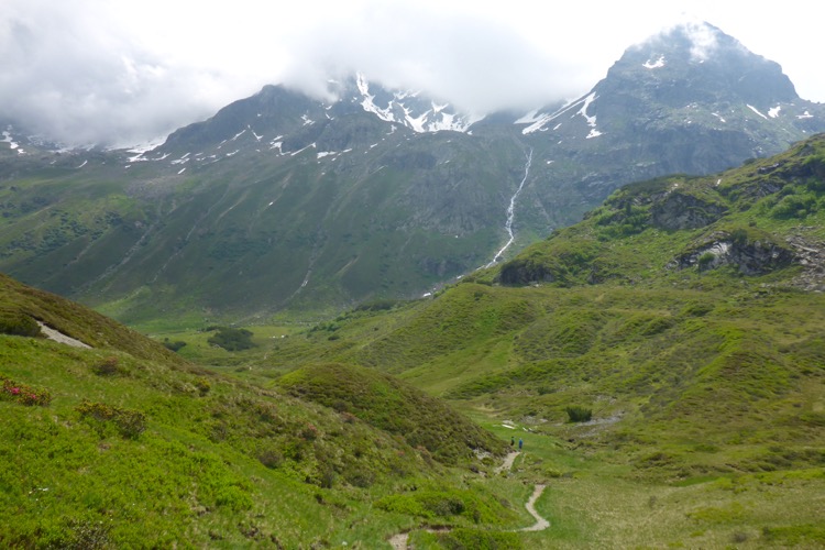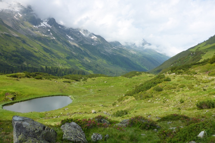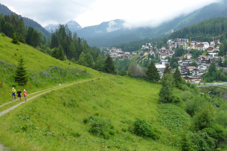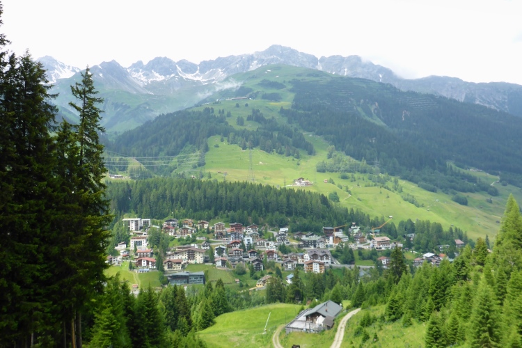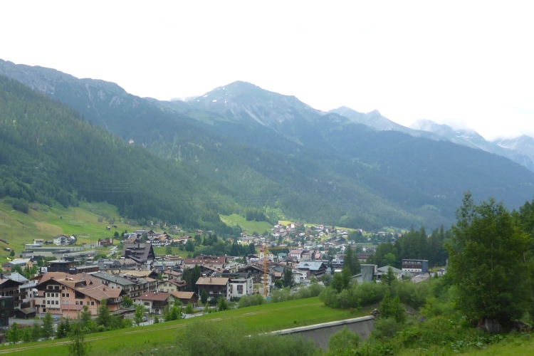 Unterhalb sehe ich St. Anton, die Berge sind überwiegend hinter Wolken verborgen. St. Anton am Arlberg ist einer der bekanntesten Wintersportorte der Welt und wird oft auch als Wiege des alpinen Skifahrens bezeichnet. Ab der nächsten Wintersaison entsteht hier durch neue Bergbahnen das größte zusammenhängende Skigebiet Österreichs. Doch auch im Sommer für Wanderer ist diese Region durchaus attraktiv, vor allem aber viel ruhiger als in der weißen Jahreszeit.