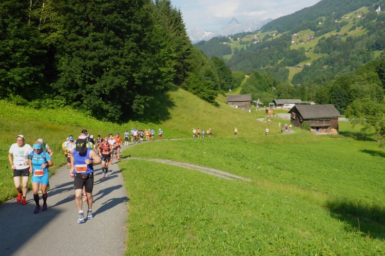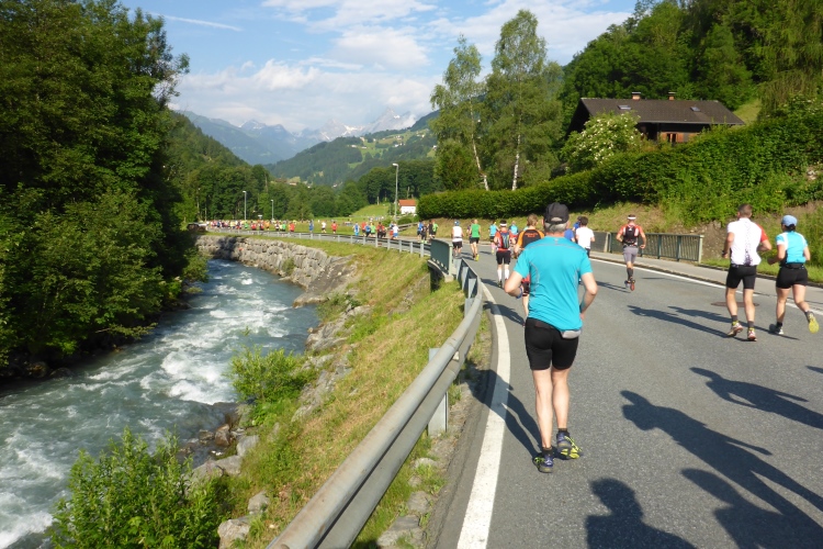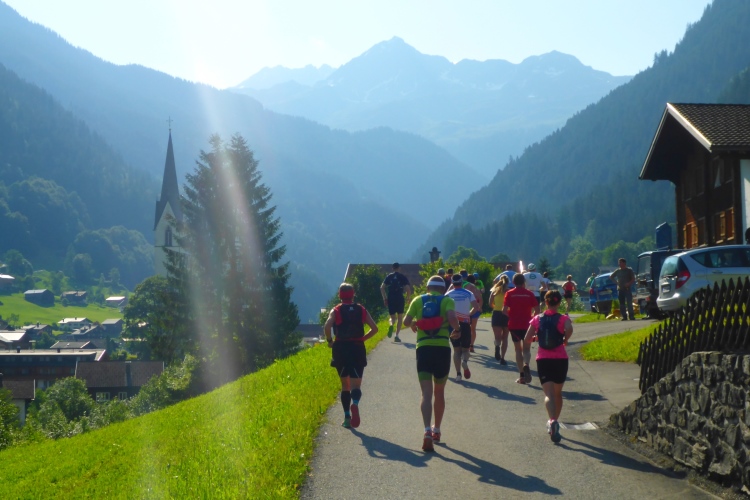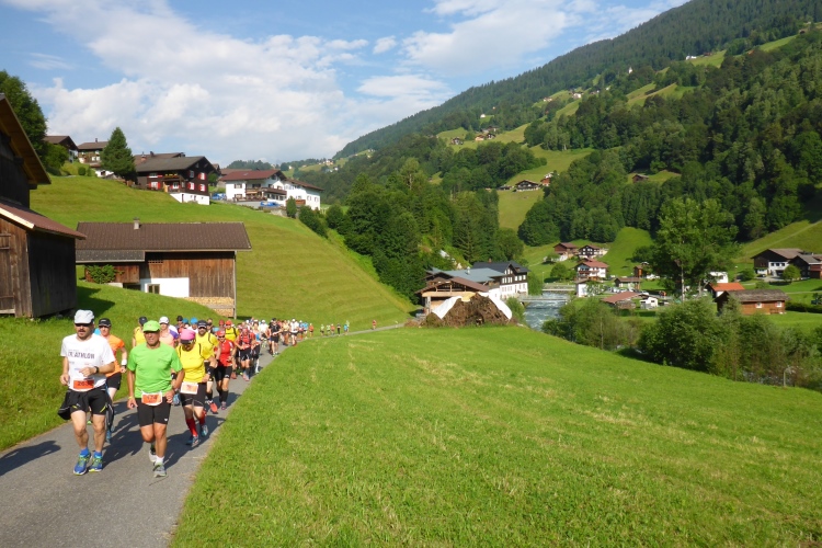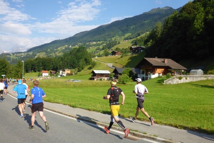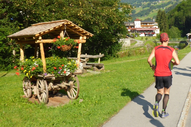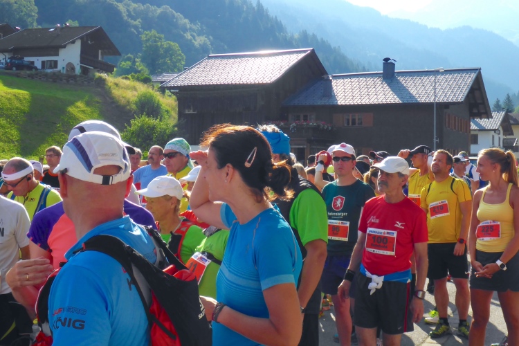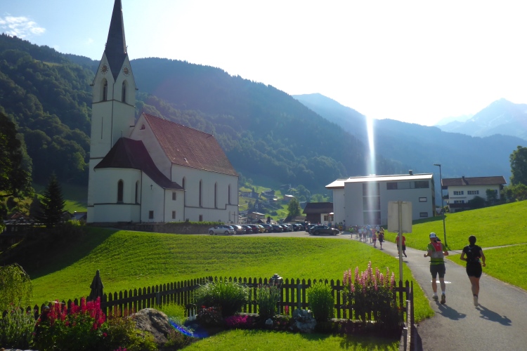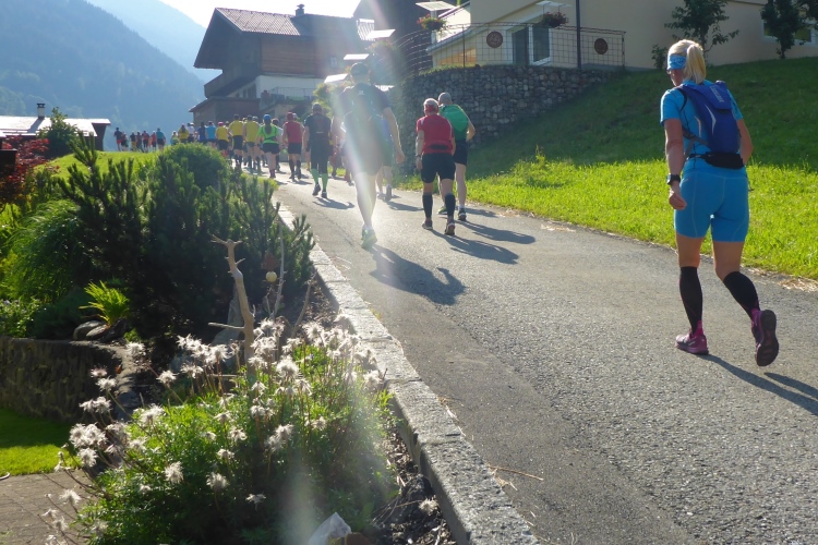 Um 8.30 Uhr geht es dann auch für uns Marathonis los. Da der Start auf 886 m Höhe und das Ziel auf 1304 m liegt, stehen uns heute entsprechend 418 Höhenmeter mehr Auf- als Abstieg bevor. Im Gegensatz zum T33 führt die Marathonstrecke zuerst eine Runde die Straße hinab in Richtung Schruns und dann mal auf Asphalt, mal auf unbefestigtem Weg zurück zum Startbereich. Gestern hatte der Wetterbericht für heute Morgen trübes, kaltes Wetter angekündigt, statt dessen ist es jetzt noch sehr sonnig und auf den ersten drei Kilometern fast zu warm zum Laufen. Vorbei an vielen mit Blumen verzierten Vorgärten ist diese erste Schleife eine reine Genuss-Strecke.