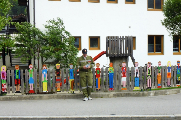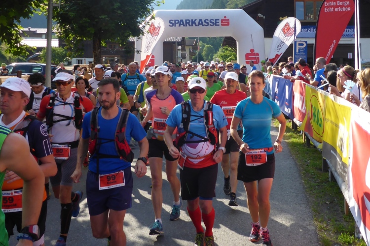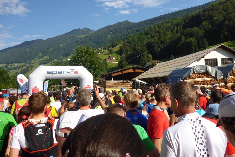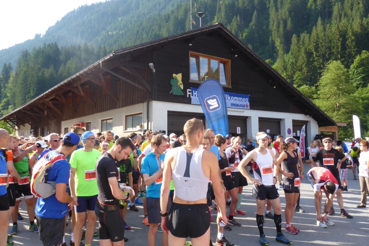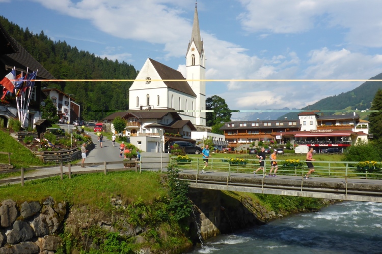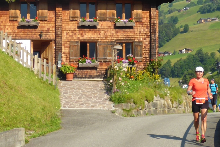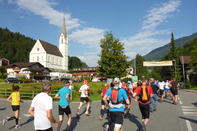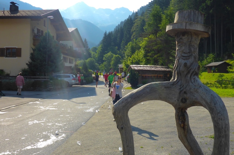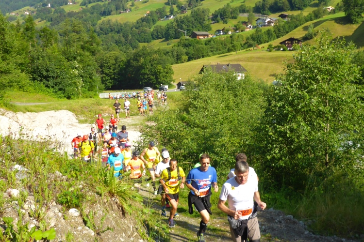 Um 8.30 Uhr geht es dann auch für uns Marathonis los. Da der Start auf 886 m Höhe und das Ziel auf 1304 m liegt, stehen uns heute entsprechend 418 Höhenmeter mehr Auf- als Abstieg bevor. Im Gegensatz zum T33 führt die Marathonstrecke zuerst eine Runde die Straße hinab in Richtung Schruns und dann mal auf Asphalt, mal auf unbefestigtem Weg zurück zum Startbereich. Gestern hatte der Wetterbericht für heute Morgen trübes, kaltes Wetter angekündigt, statt dessen ist es jetzt noch sehr sonnig und auf den ersten drei Kilometern fast zu warm zum Laufen. Vorbei an vielen mit Blumen verzierten Vorgärten ist diese erste Schleife eine reine Genuss-Strecke.