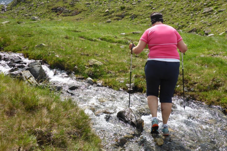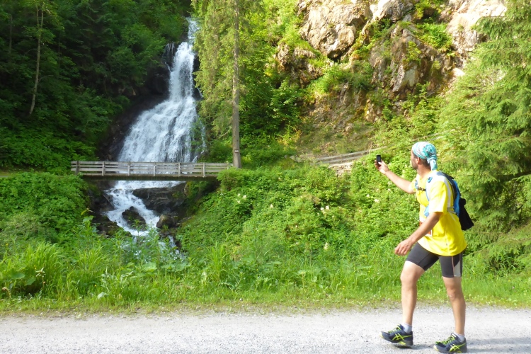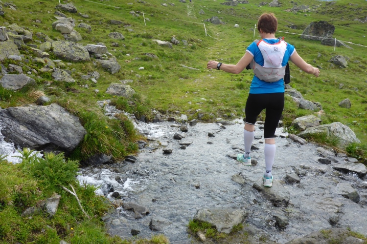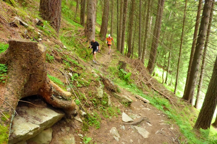 Dann beginnt der Trail. Wie schon beim Start angekündigt, ist der Weg oft recht nass. Wer keine nassen Füße mag, muss immer wieder Pfützen und Schlammpassagen ausweichen. Manchmal muss man auf dem sehr unebenen Untergrund sehr gut aufpassen. Man läuft auf weichem Boden, immer wieder überquert man mit einem großen Sprung Bäche oder balanciert von Stein zu Stein drüber. Mir gefällt das natürlich sehr gut. Hier kommt man allerdings nur recht langsam voran, aber seine Marathon-Bestzeit will ja ausgerechnet auf einer Gebirgsstrecke niemand verbessern. Immer wieder sind Helfer der Bergwacht an der Strecke, die ihre Freizeit für unsere Sicherheit opfern. Vielen Dank!