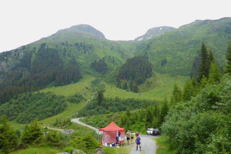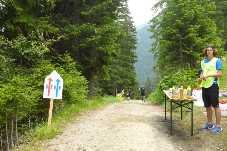 Noch kurz auf dem Trail bergab, dann steht am Übergang zu einem bequemem Forstweg auf 1903 m die nächste Verpflegungsstelle. Von dort aus kann ich nun einige Kilometer schnell abwärts laufen. Bäume gibt es keine, aber herrlich blühende Alpenrosen.