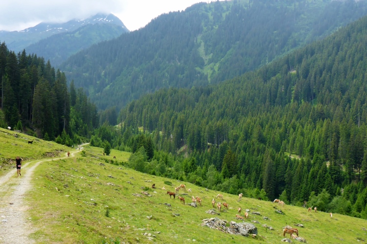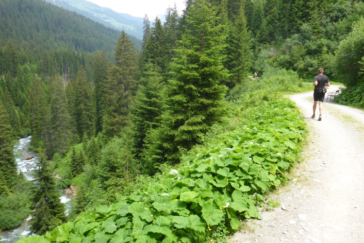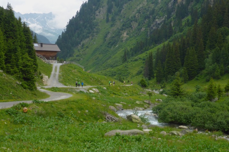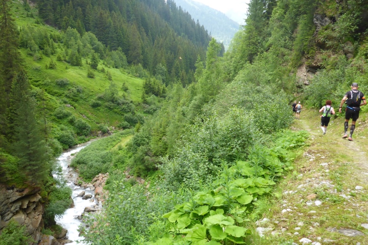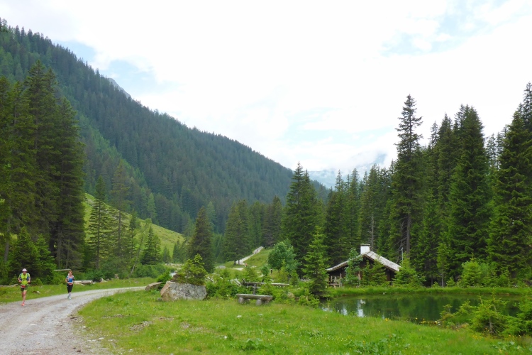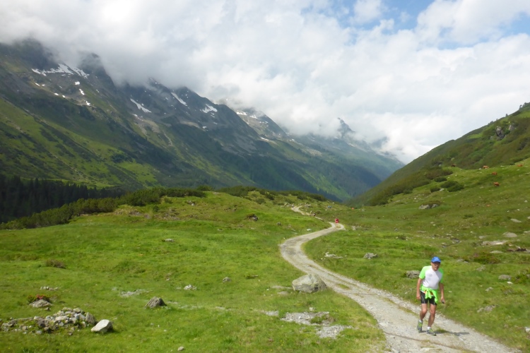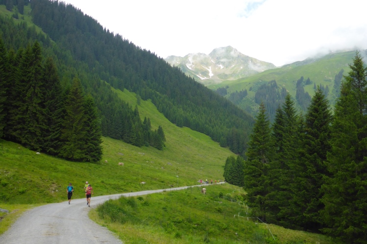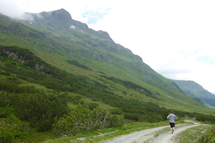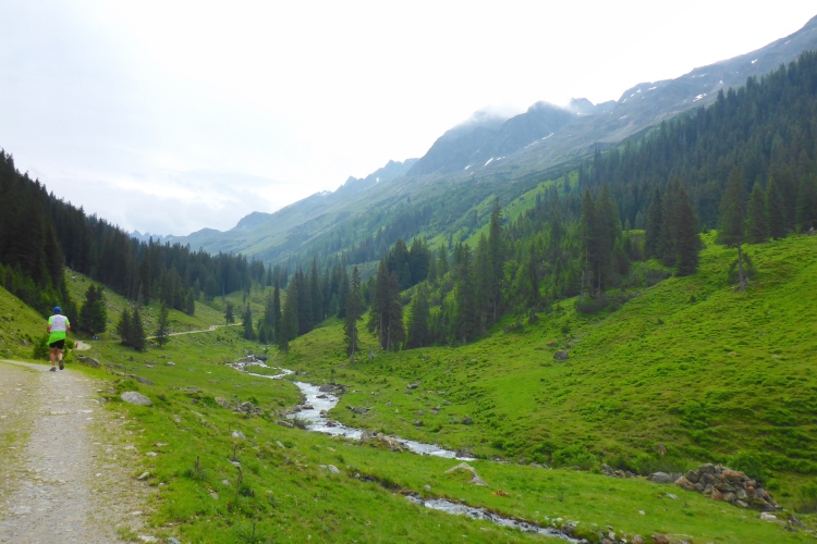 Dann folgen wir dem Fluss Litz bergauf durch das für eine Weile recht enge und stark bewaldete Silbertal. Immer rauscht neben uns das Wasser. Meist ist die Steigung moderat, so dass ich nur selten marschieren muss. Hier hole ich Annette ein. Ich bin zwar der schnellere Läufer von uns beiden, aber ich bleibe ja oft zum Fotografieren stehen. Wir steigen eine Weile gemeinsam auf, dann gebe ich Gas. Am Himmel ziehen immer mehr Wolken auf und verhüllen bereits einzelne Berggipfel. Ich will möglichst den höchsten Punkt der Strecke erreichen, um die Aussicht genießen und in Bildern festhalten zu können. Ich laufe nun deutlich schneller, als ich es hier normalerweise machen würde. Durch die Bewölkung ist es nicht mehr so warm wie vorhin. Insgesamt empfinde ich auf der restlichen Strecke die Bedingungen als recht läuferfreundlich.