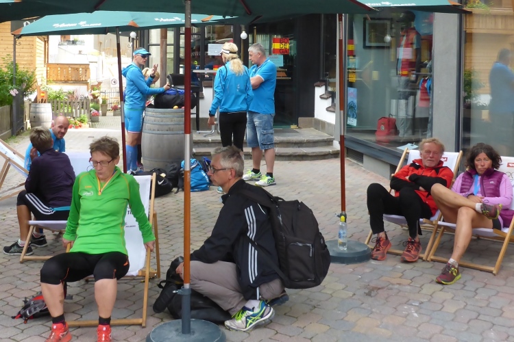 Im warmen Sonnenschein verbringen wir nach der Startnummernausgabe die Zeit vor dem Feuerwehrhaus. Annette und ich begegnen hier einigen Läufern, die ich schon bei anderen Veranstaltungen traf, unter anderem Axel und Axel. Außerdem lerne ich Marathon4you-Kollege Anton Reiter kennen.