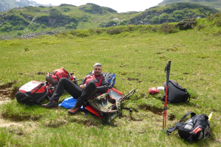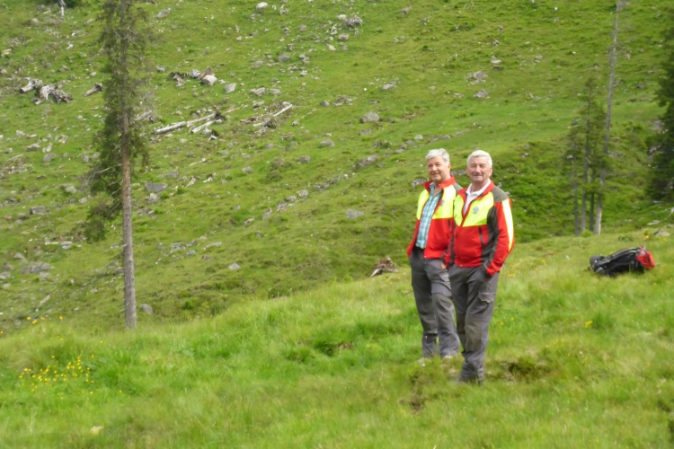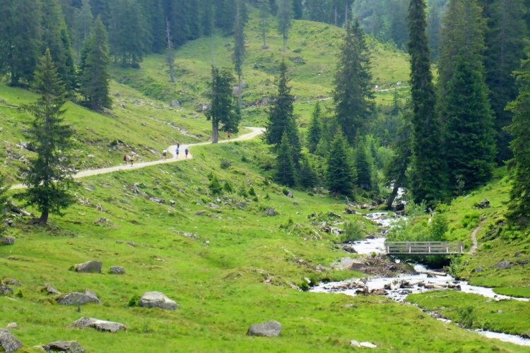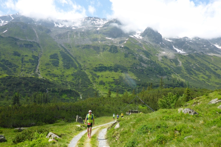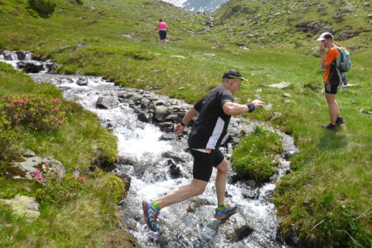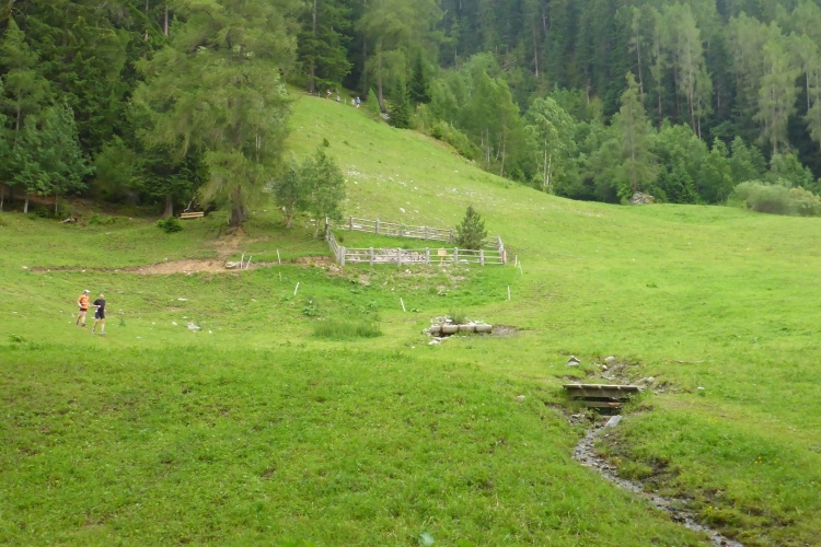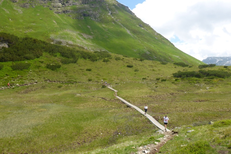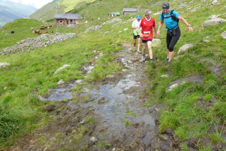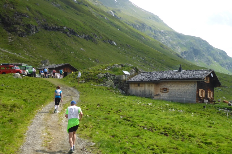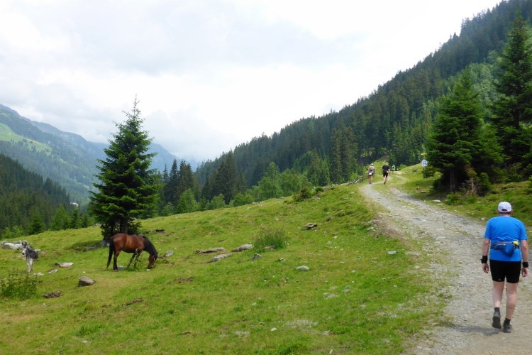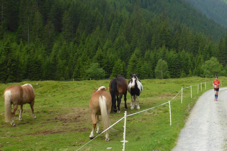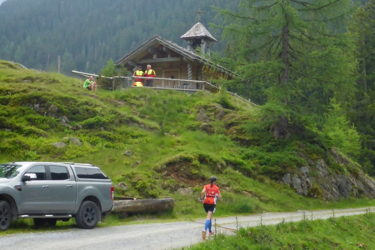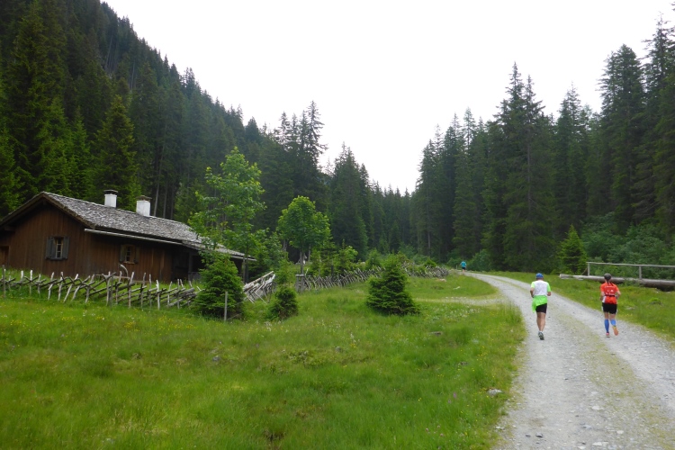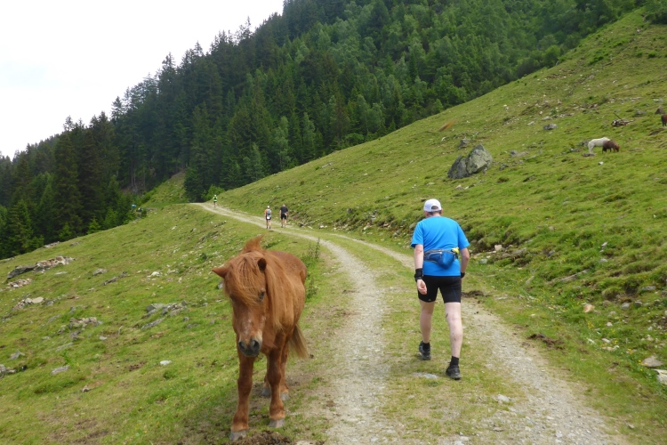 Vorbei an einigen Almen kommen wir immer weiter hinauf, nach wie vor stets neben dem Bach. Oberhalb des kleinen Schwarzsee wird die Landschaft immer wilder. Wir kommen an einem Jeep vorbei, neben dem ein hoher Sendemast aufgebaut ist. Schon überhole ich die ersten (bzw. letzten) Teilnehmer des T33, die eine halbe Stunde und einige Kilometer Vorsprung haben. Einmal kommt mir ein Mountainbiker entgegen, dem man die Enttäuschung, wegen der Läufer bergab vom Rad absteigen zu müssen, deutlich ansieht.