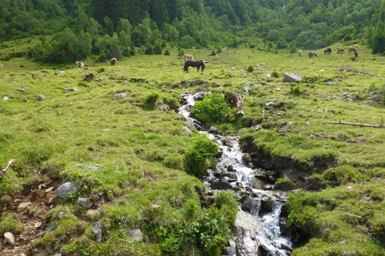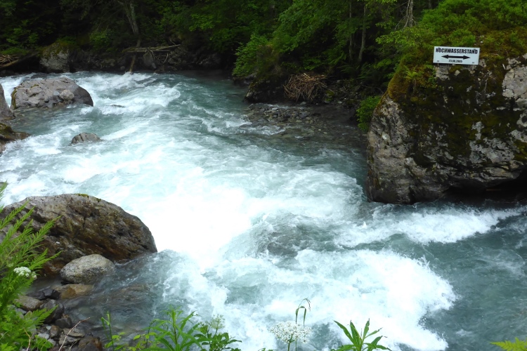 Die Strecke neben dem munter plätschernden Bach macht Spaß. An einer Stelle zeigt eine Tafel den Hochwasserstand aus dem Jahr 2005. Damals hätte man hier nicht laufen können. Bald weitet sich das Tal. Hier gefällt es mir ausgesprochen gut. Der Anstieg ist nach wie vor nicht zu steil und je höher ich komme, desto schöner wird die Umgebung.