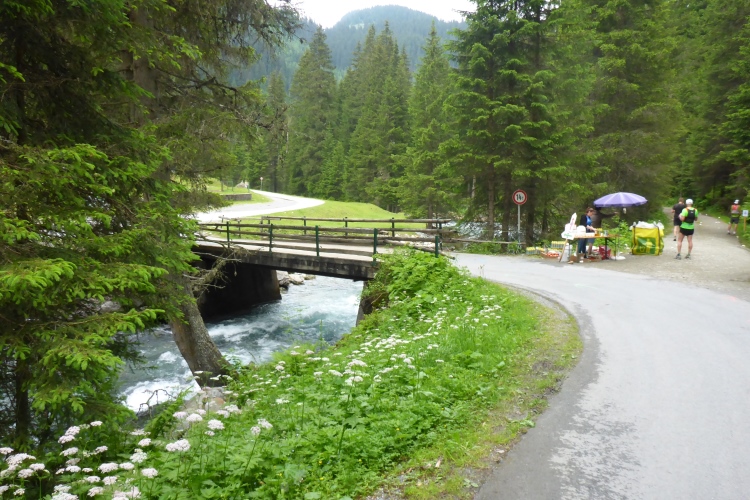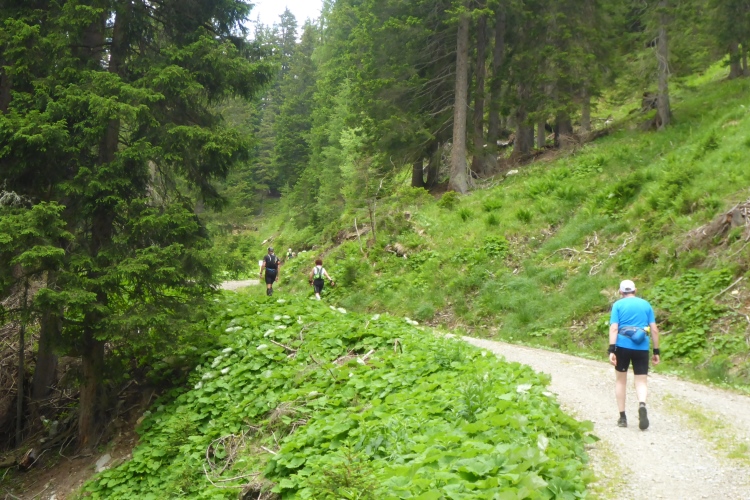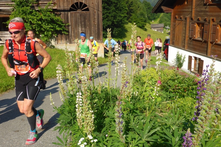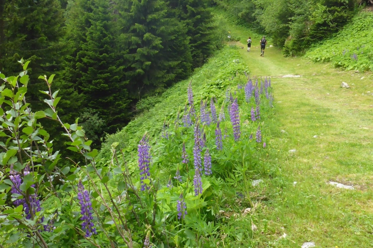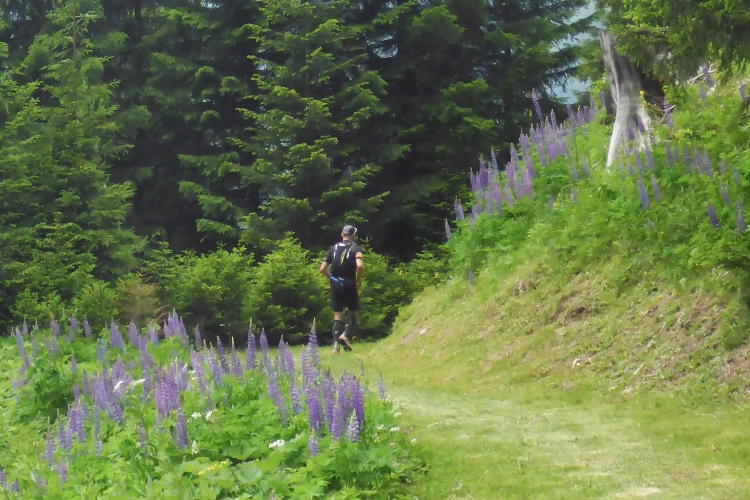Nach einer Verpflegungsstelle geht es mal wieder lange Zeit bergauf. Ist dies bereits der demotivierende Aufstieg am Ende der Strecke, von dem mir einige Läufer erzählten? Nach einer Weile geht es in schnellem Lauf wieder bergab. Aber der nächste kraftzehrende Aufstieg folgt sogleich. Nach einer Brücke führt ein Trail kurz steil bergab, dann wird der Weg wieder einfacher. Rechts und links blühen Lupinen. Ich treffe auf zwei Läufer, die vor drei Wochen auch in Liechtenstein waren.
