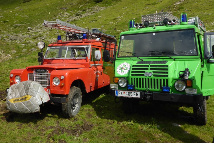 Neben einer Verpflegungsstelle stehen zwei Oldtimer-Feuerwehr-Fahrzeuge. Toll, dass die noch immer so fit sind. Die Berge vor mir sind nun wieder fast wolkenfrei. Ich mag nicht wissen, wie viele Selfies heute an diesem Streckenabschnitt von den Teilnehmern sofort auf ihre Facebook-Seite oder in ein anderes Netzwerk gestellt werden.