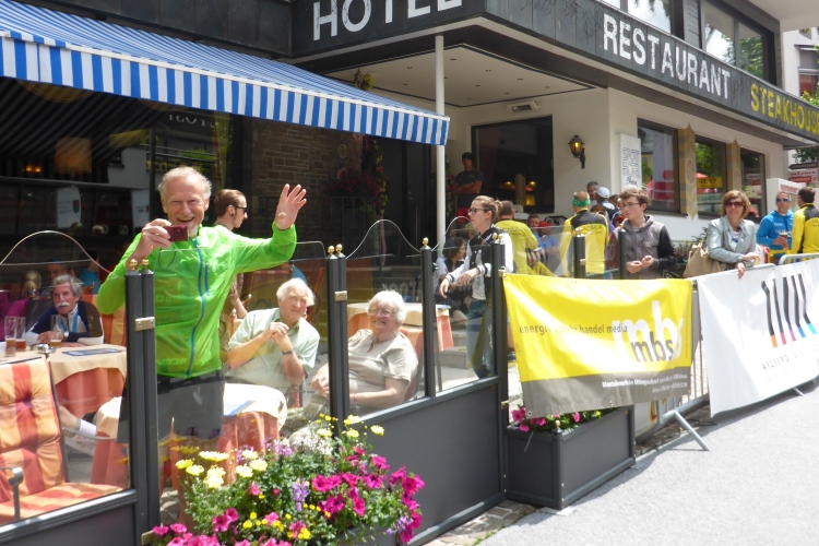 Wir laufen nicht direkt in den Ort hinunter. Mit einer Folge von kurzen Auf- und Abstiegen geht es zunächst am Ort vorbei, zuletzt auf einem herrlichen Wurzeltrail. Über eine Wiese laufen wir abwärts, dann kurz auf einer Straße am Fluss entlang, über eine Brücke und dann unter der Bahnlinie hindurch. Zuletzt führt uns eine lange Straße durch den Ort direkt ins Ziel. Vor den Cafés und Restaurants sitzen etliche, medaillengeschmückte Läufer.