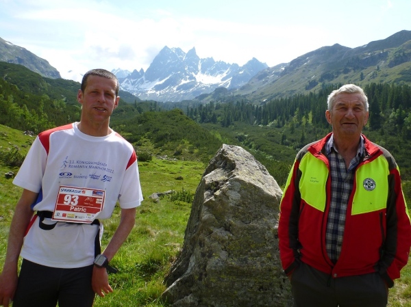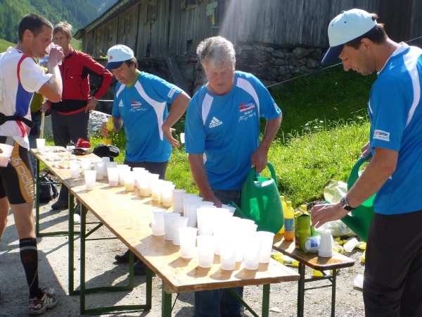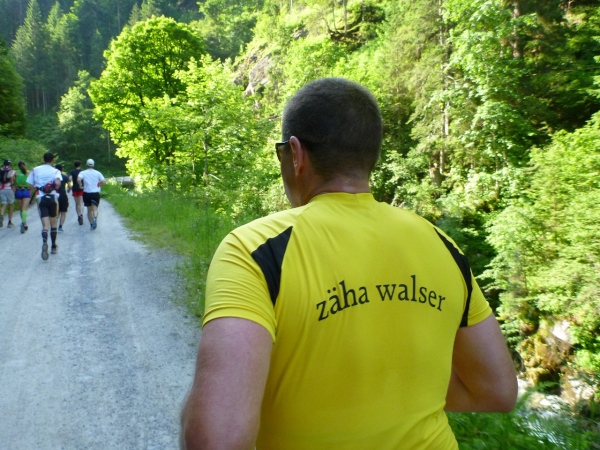 Ab der Gafluna-Alpe (1360 Meter, Kilometer zwölf) weicht der Wald dem Almgelände, das Tal wird kurzzeitig etwas breiter. Wir merken schon die Höhe, die Temperatur ist noch lauffreundlich, auch wenn es uns an den Steigungen den Dampf naushaut. Unser Laufuntergrund wird nun etwas weniger bequem. Uneben, teilweise ruppig, also entweder auf den Boden schauen oder Füße heben. Und Patric hat wohl einen Moment nicht aufgepasst, denn im nächsten Moment sehe ich ihn am Boden liegen und sogleich sich wieder aufrappeln. Einen kurzen medizinischen Check erfährt er bei der Unteren Freschalpe (1572 Meter). „Das ist unsere Arbeit, dafür sind wir da“, sagt der Sanitäter. Ein paar Spritzer Desinfektionsmittel aus der Flasche und Patric springt weiter.