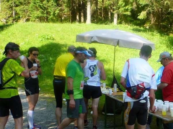 Einige Meter weiter an der Freschalpe lasse ich meinen Wunsch nach einem Hopfengetränk sachte anklingen. Der Helfer hört gut und springt im Galopp in die Hütte. Und nach wenigen Sekunden kriege ich ein kühles Blondes stilgerecht im Glas serviert. Wahrscheinlich bekomme ich jetzt wieder vom Reporterkollegen Wolfgang B. eine Mail mit dem Vorwurf: „Du säufst ja Bier beim Marathon.“ Aber Bier ist in der Bayerischen Verfassung als ein Volksnahrungsmittel deklariert. Und ich bin Bayer! Gut gemundet hat das Pils außerdem. Nur dass Patric wieder weit voraus ist. Aber damit kann ich leben.