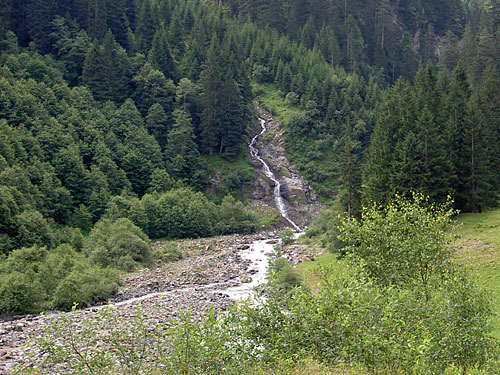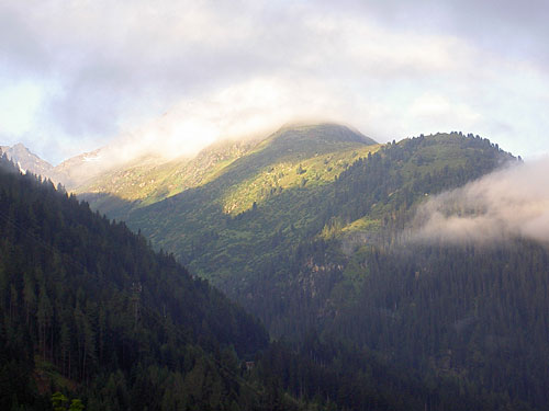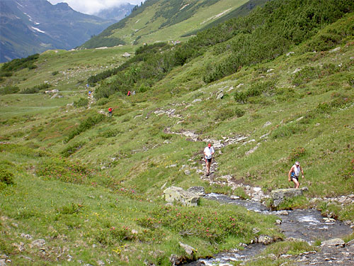 Das Wetter war ideal, vielleicht 16 Grad, bewölkt, ab und zu Sonne, schöner hätte es kaum sein können. Wir waren jetzt über 1.800 Meter und der bisher gut zu laufende Weg wurde rapide schlechter. Immer wieder auch wurde es so steil, dass ich meinen Vorsatz zweimal durchbrach und kurz ins Gehen überging, vor allem auch, weil gerade mal wieder die Sonne schien und es sofort recht warm wurde. Schatten war keiner mehr vorhanden, kein Wald mehr, keine Bäume. Innerhalb weniger hundert Meter waren wir dann auf der Passhöhe und kein Wirtschaftsweg war mehr da, nur noch ein Pfad über die Wiesen. Aber was für ein Pfad und was für Wiesen! Mehr Steine als Gras, man konnte nicht mehr joggen, da man höllisch aufpassen musste, um auf oder zwischen den Steinen den Fuß sicher aufsetzen zu können. Durch den Regen an den Vortagen war darüber hinaus der Boden aufgeweicht, so dass man auch noch aufpassen musste, nicht mit dem Schuh einzusinken. Wir liefen einem kleinen Wasserlauf entlang, in den immer wieder von links oben mehr oder weniger große rinnsale mündeten, die wir dann jeweils überqueren mussten oder auch mal drin laufen, genauer von Stein zu Stein hüpfen. Manches Mal war ich mir nicht sicher, ob das jetzt der Weg war, oder ein Zufluss zu dem Bächlein oder das Bächlein selbst. Von überall her kam das Wasser. Alles in allem eine schöne Gegend, aber zum Joggen denkbar ungünstig.