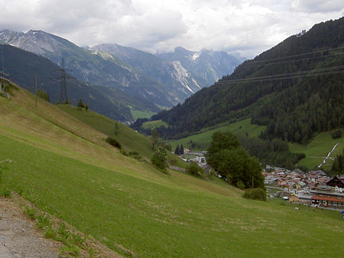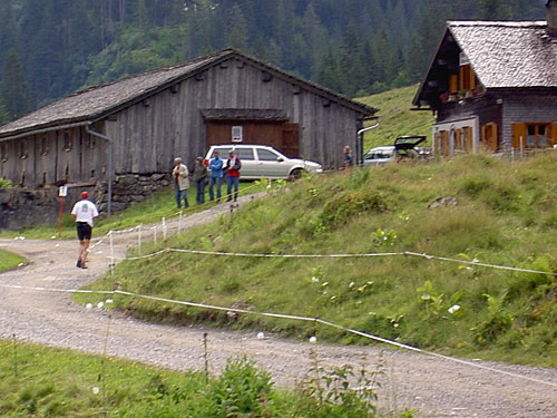 Wir hatten die Zivilisation erreicht, waren an einigen Häusern vorbeigekommen, als sich rechts vor uns das Tal mit St. Anton auftat. Oh je, da runter mussten wir noch, das konnte ja noch was werden, schon wieder so ein elendes Gefälle! Aber es kam noch schlimmer, der Weg führte nicht abwärts, sondern in Serpentinen nach oben. Offensichtlich mussten wir hier noch Kilometer machen, damit wir auf die volle Marathondistanz kamen. Joggen war hier nicht mehr möglich, also hieß es gehen! Anschließend lief man auf einem welligen Pfad in ständigem Auf und Ab den Hang entlang weit oberhalb an St. Anton vorbei. Auf diesen zwei Kilometern war unser Schnitt wieder auf 8:46 min/km gefallen.